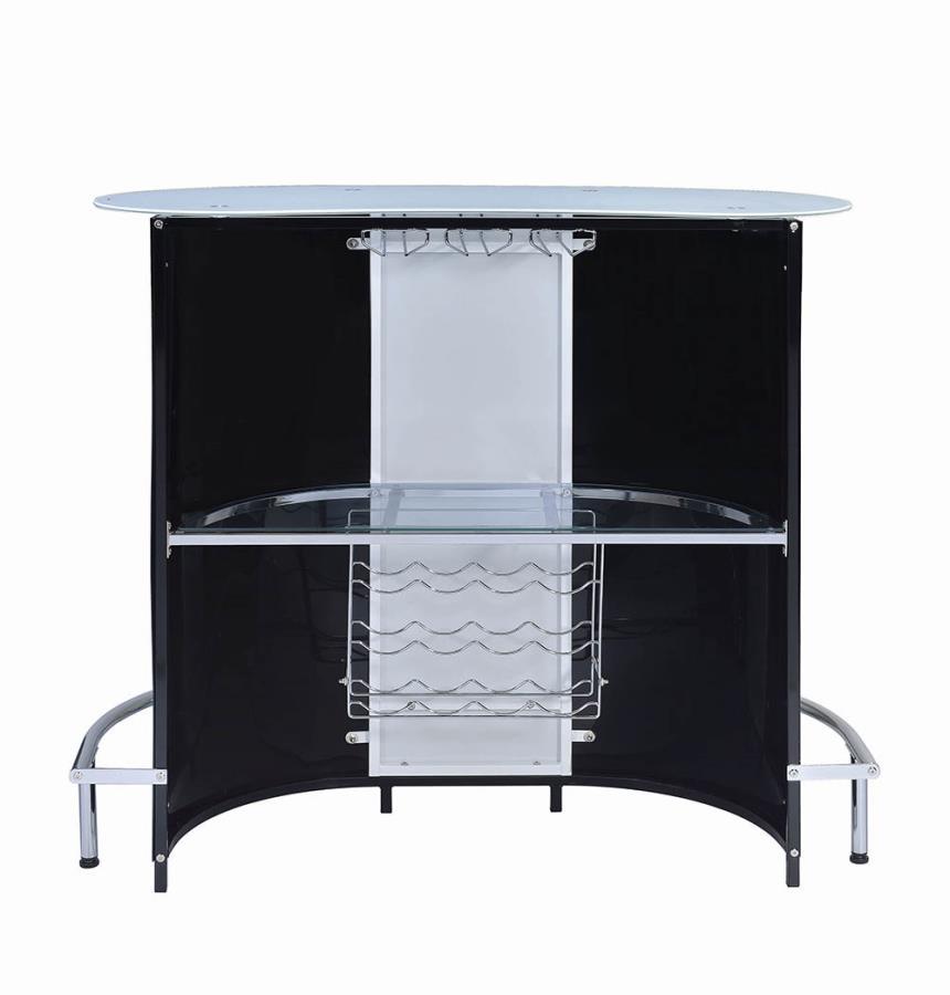 You'll be the life of the party when you step behind this sleek, contemporary bar unit. its tempered glass top provides plenty of space to show off your mixology skills. striking panels of black and white acrylic adorn its base, giving it a bold appearance. a sturdy metal foot rest allows guests to rest their feet comfortably. this unit offers lots of space to store your bar accessories and looks fabulous in a parlor or recreation room.