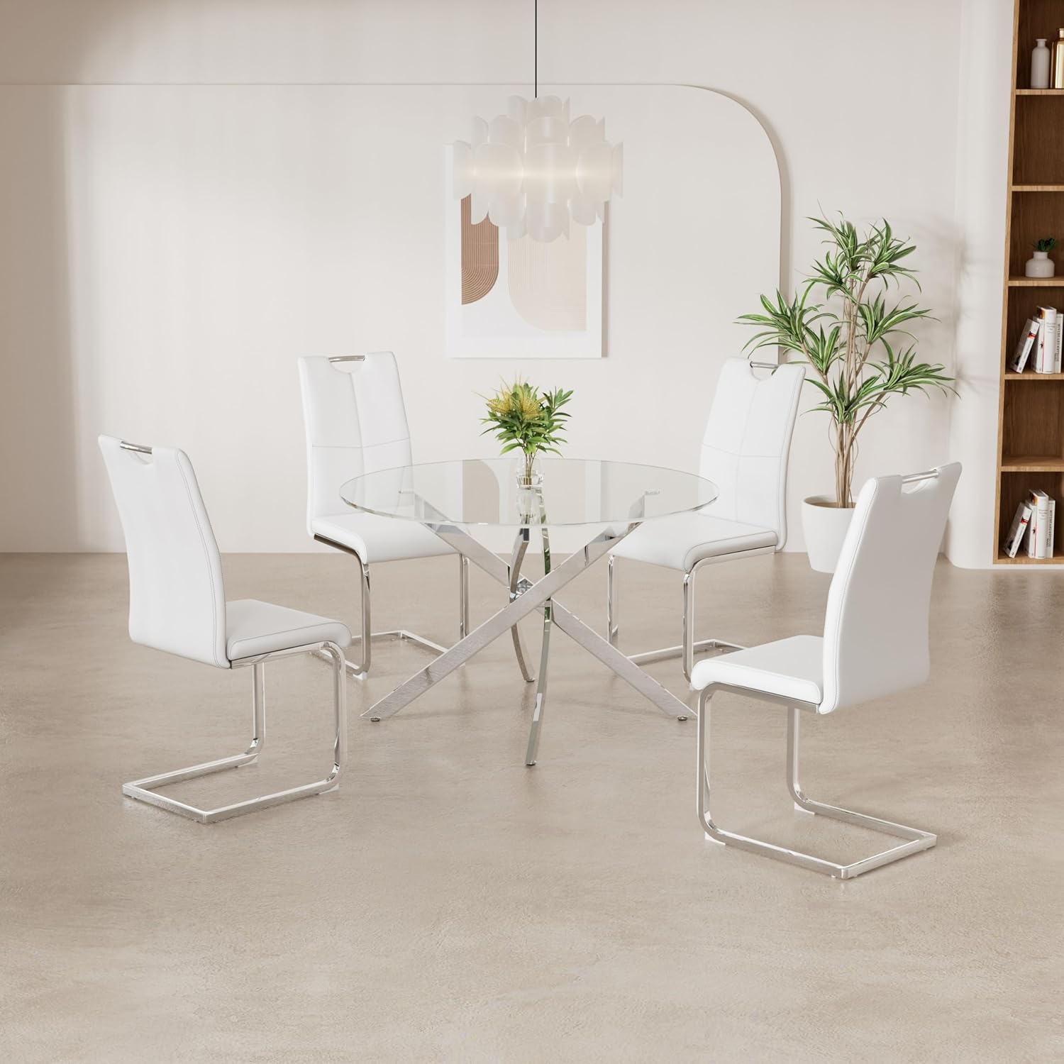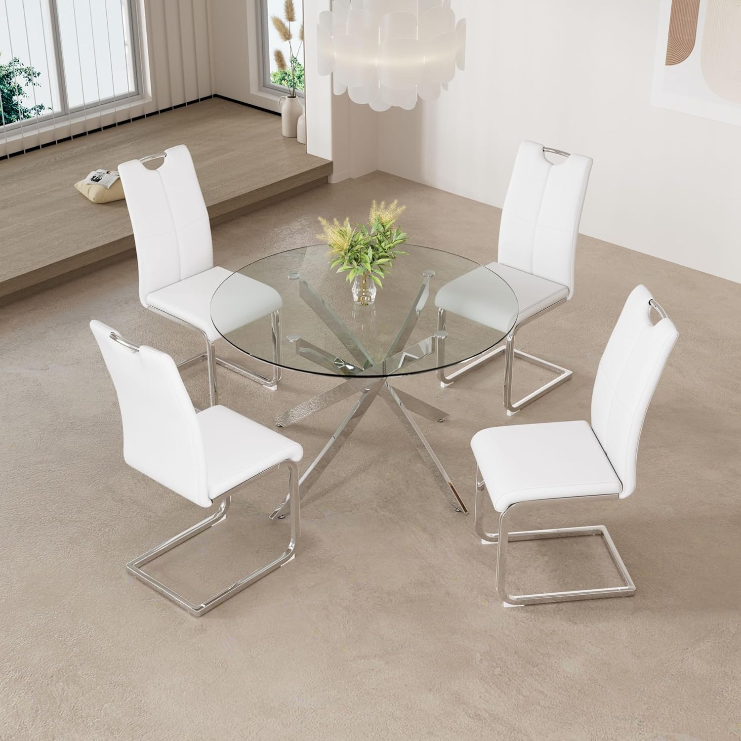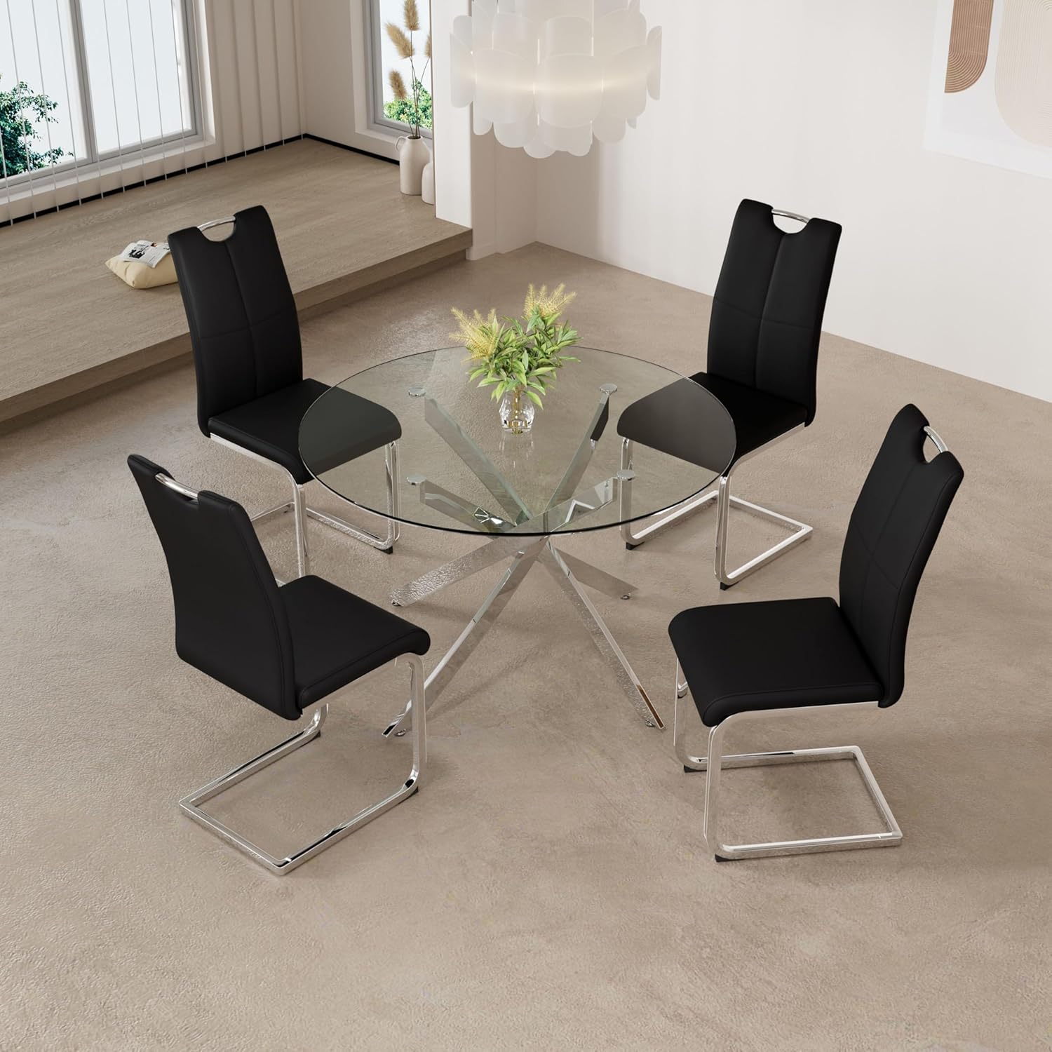 This 5-piece glass dining table set features a simple and chic look that can easily fit into a variety of decor styles. Bring a unique and stylish touch to your home with this table set.