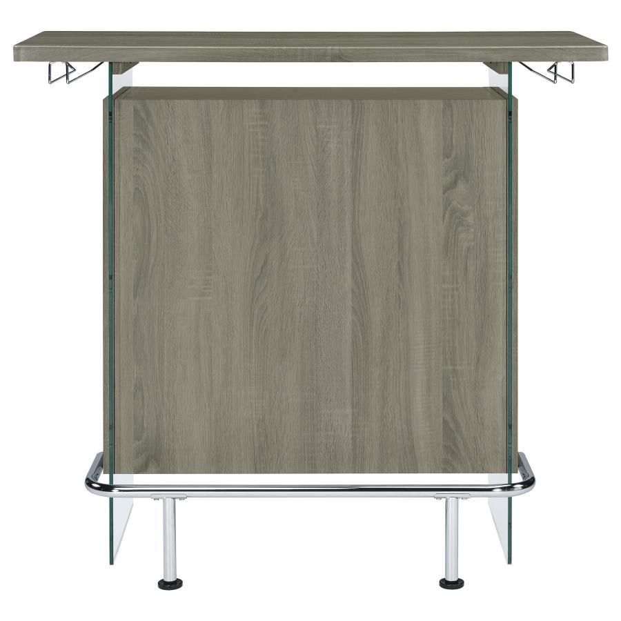 Elevate a multipurpose living room with this modern bar unit. a neutral finish, accented with polished chrome metal accents offers a striking design contrast. supported and flanked by clear tempered glass side panels, this bar unit boasts ultra-modern elements as well for a dramatic feel. compact yet highly functional, this bar unit also features ample storage space with six built-in open shelves for storing bottles, serving pieces and other mixologist must-haves. tucked beneath the bartop along each side is a stemware rack for wine glasses and more.