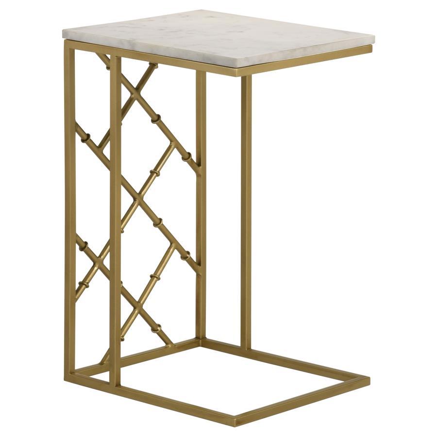 Slide this contemporary accent table up to a seating arrangement to keep a beverage or snack close at hand. this c-shape cantilever table is designed with a flush base that supports a rectangular table made of a white marble top that lends a classical flair and glam touch. spacious enough for a tablet or laptop as well, this snack table is supportive and stable, built with an iron frame that features slim vertical supports and a crisscross design along the side for a charming design element. keep this table near a sofa or sectional to create an additional workspace for guests and company. or keep it in a home office as a second workstation.