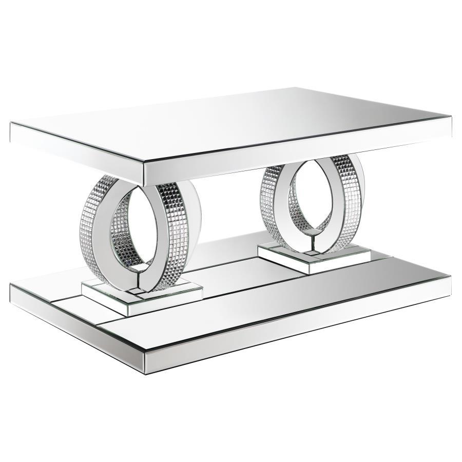 Drop this breathtaking, glam coffee table at the center of a seating area. created with a rectangular shape, covered with polished, gleaming mirror surfaces, this coffee table creates a refined look within a living room and entertainment area. a pedestal-like base with sphere-inspired, interconnected dual rings pushes total hollywood regency vibes. each pedestal ring base is wrapped in a scintillating, faceted mirror-like tiles around the outer edges for a striking visual effect. softly beveled edges on each mirror trim and tile further add to the classy nature.