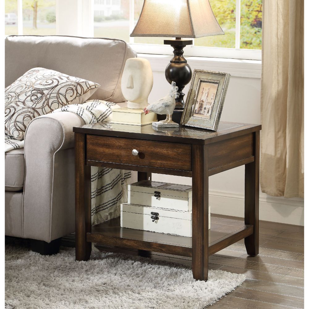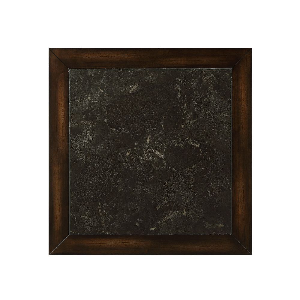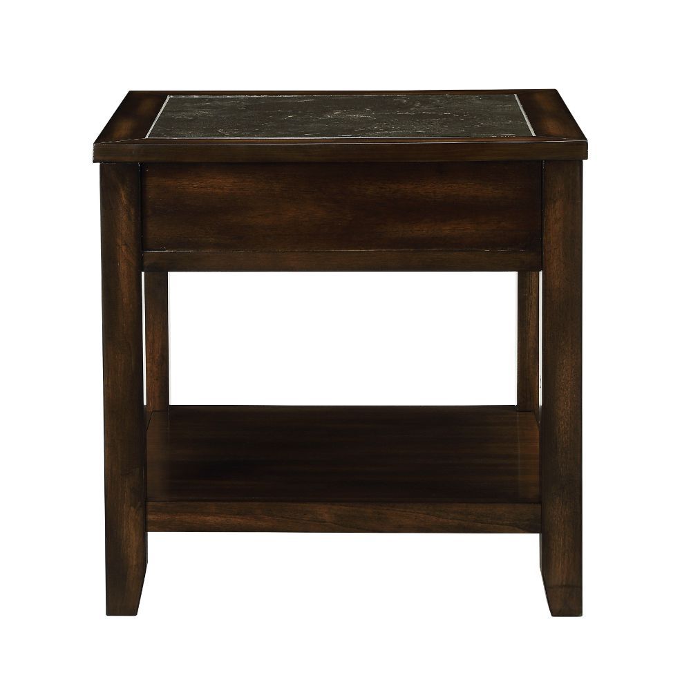 KD, Square Leg End Table with Marble Inlay • Storage: 1 Drawer, Open Compartment (Bottom Shelf, Drawer Interior Size: 14 x 14 x 3"H) •• CONSTRUCTION •• Wood Top Drawer & Shelf: Walnut Finish & Marble Inlay; Wood Veneer, Wood, MDF; Top Thick 23mm • Wood Leg: Thick 40mm ••• Drawer: GLIDE Center Wood (2/3 Ext.), DOVETAIL Not Included, Felt-Lined Drawer, Safety Stop NOT Included, Manual Close, Hardware: Single Knob