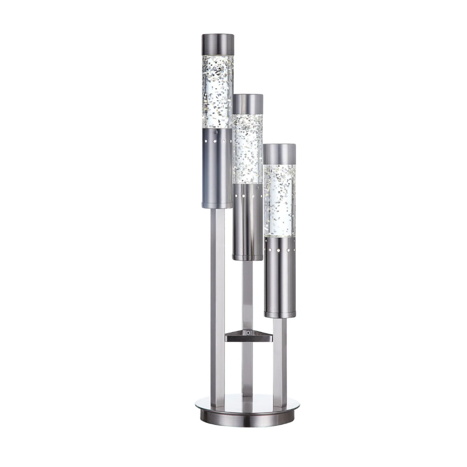Illuminate your space in style with this Claus lighting collection, a must-have that will add an elegant feel to any room. Featuring a brushed nickel metal base, the construction is sturdy yet stylish. Within the glass tube, there are sequins and water; and the sequins will be flowing once the light is turned on. Unique, beautiful and chic, this lighting collection will add an artful touch and be the centerpiece in any room.