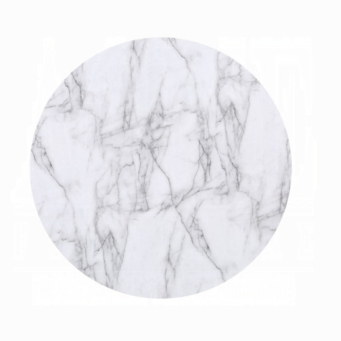 This elegant, contemporary, five-piece dining set completes formal dining experiences with a round, white, cultured marble, and rustic espresso pedestal table and four upholstered parson style side chairs. Charming details like button-tufted rolled backrests, bold nailhead trim, and flared legs lend a classical approach with modern elements.