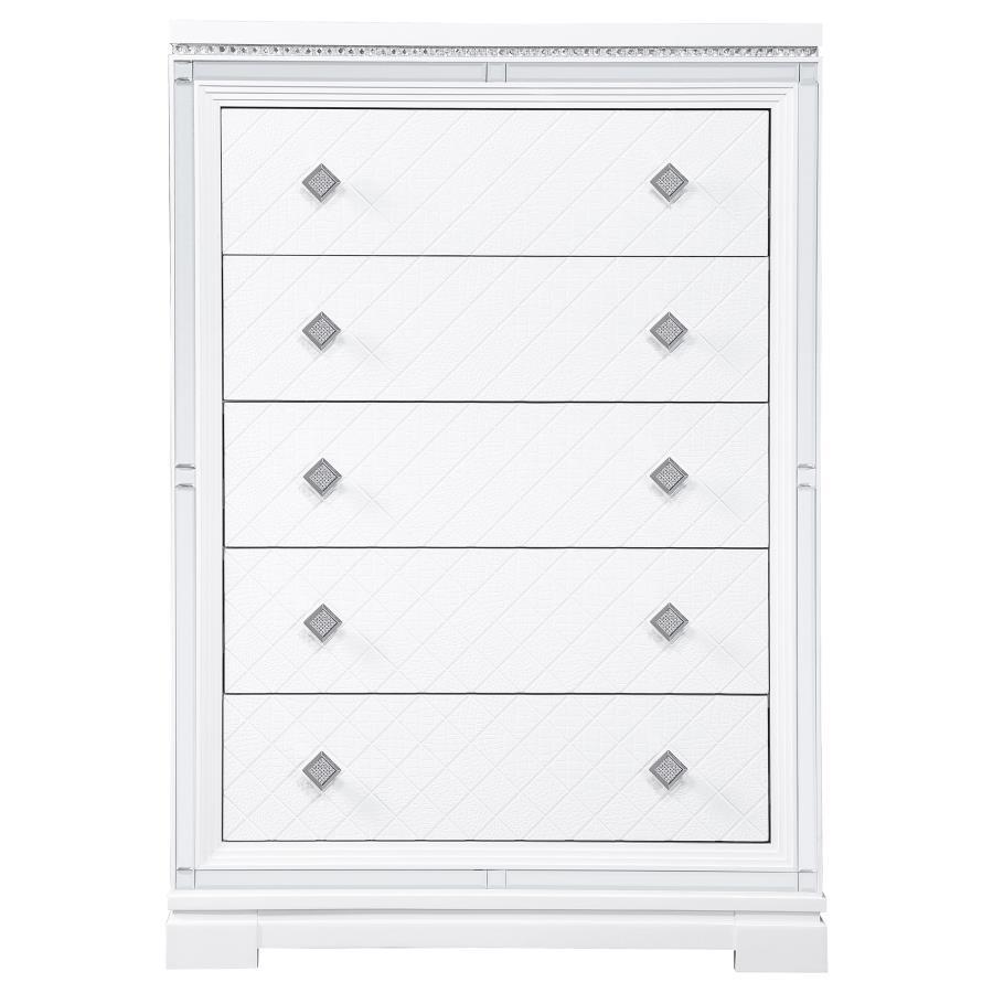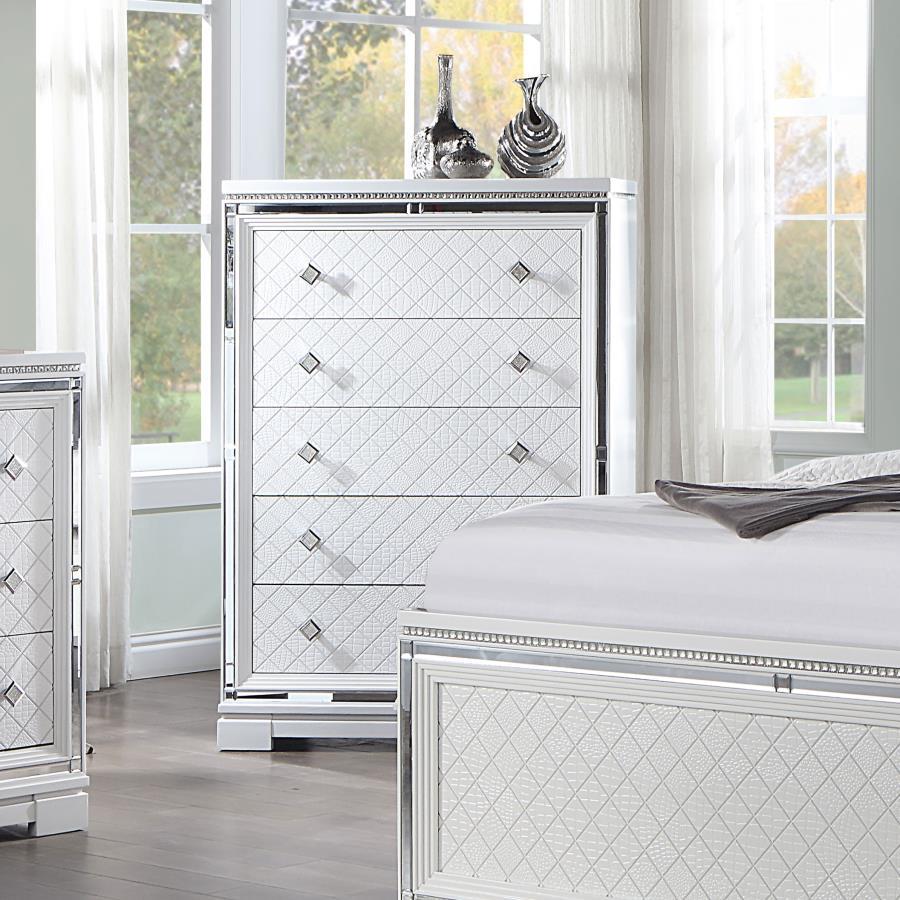 Create a luxe look to a contemporary bedroom with this stunning, glam five-drawer chest. the stack of spacious drawers showcases a dual crocodile and diamond embossed surface, adorned with glimmering crystal-encrusted hardware. surrounded the set of drawers is a tiered wood trim molding, flanked by a mirror trim and tile accent to create a polished look. as part of the eleanor bedroom set, this chest of drawers also boasts a clean, bright finish that works with many colors. thoughtful and compact, this chest also comes with a felt-lined top drawer to keep delicate garments and accessories, and can free up floor space in a tight bedroom.