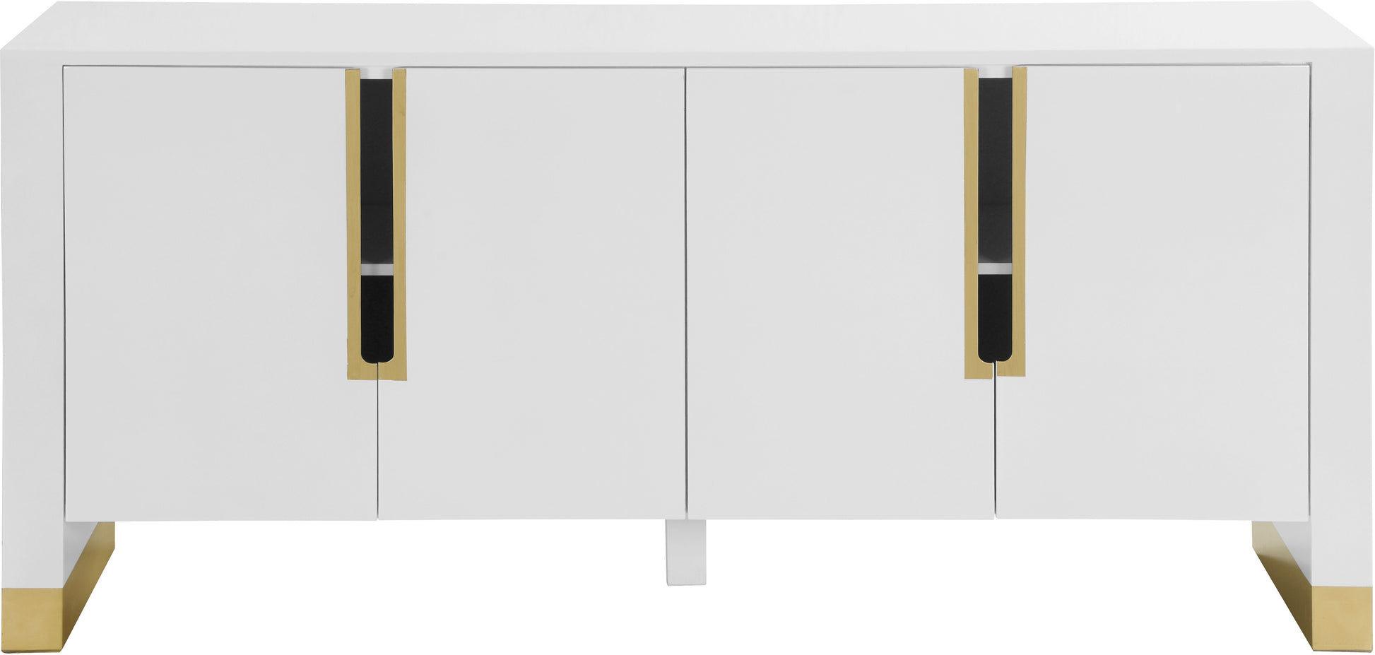 Make a bold statement in your living space with this eye-catching Florence Sideboard/Buffet from Meridian Furniture. Its deep lacquer is complemented by a finished base, creating a contemporary design that's both modern and stylish. Four side cabinet doors open up to reveal four cubby spaces, giving you ample room to safely tuck away dishes, pots and pans, knick-knacks, books, or other household items, while the top of the sideboard/buffet doubles as shelf space for items you want on display.