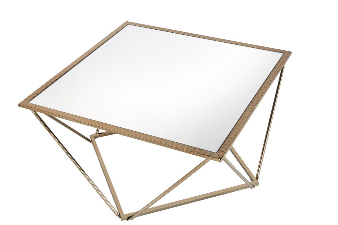 Bring dimension, depth and distinctive visual appeal to the whole space with this modern geometric design. Square table top is paired with irregular metal base, adding a uniquely attractive contrast to this table. The champagne gold finish showcases it geometric metal frame while mirrored table top infuses it with glamour. Add alluring flair and modern sophistication to your seating arrangement with the Fogya Coffee Table.