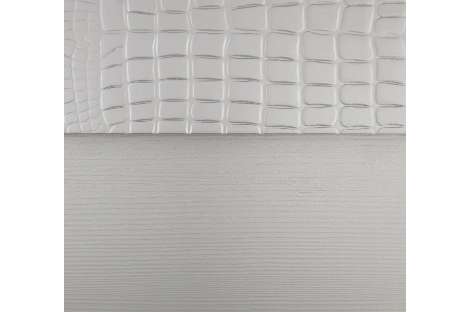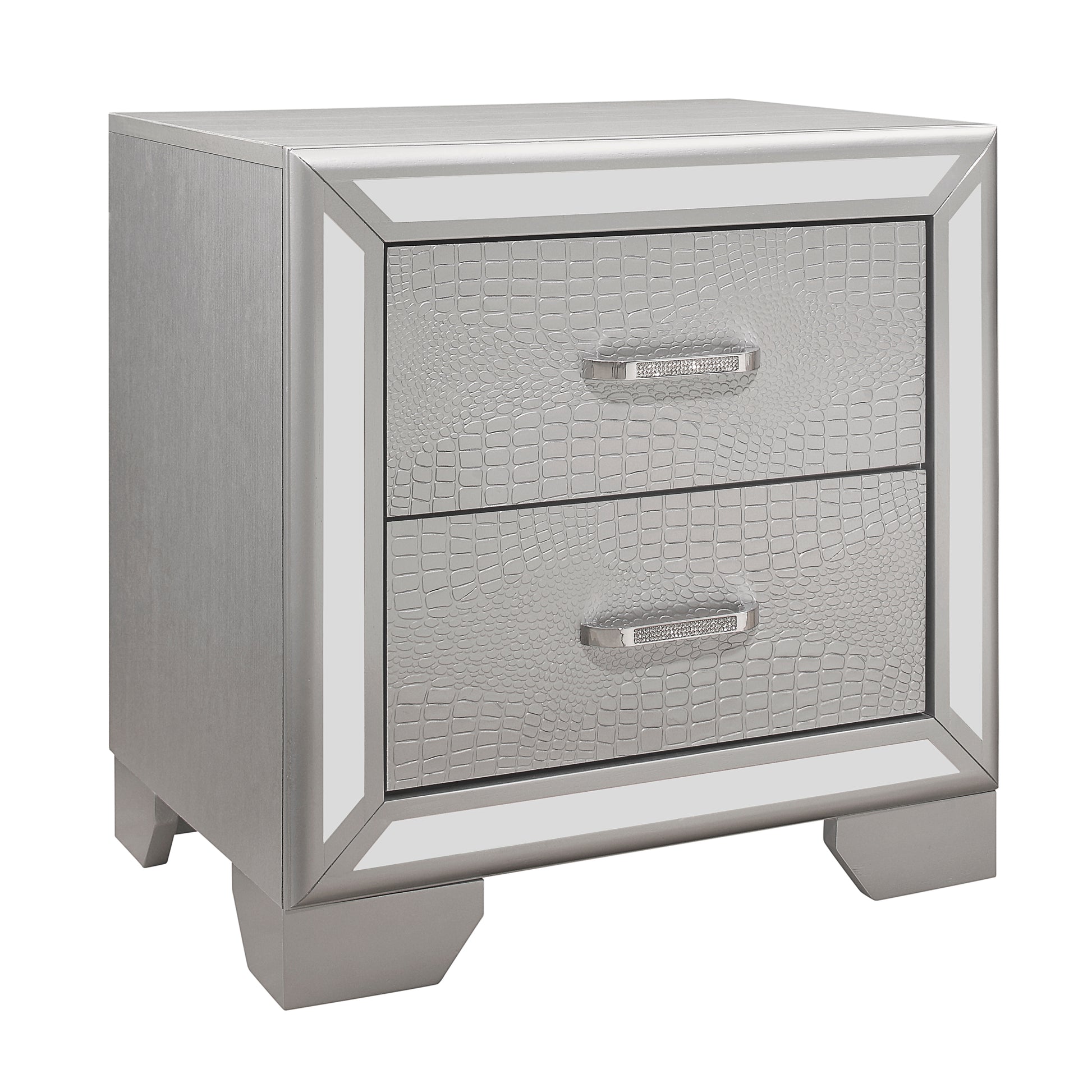Elegant touches abound with the design of the Aveline Collection. Alligator embossed veneer covers the collection and is finished in silver, an elegant palette that beautifully pairs with your bedroom’s accessories and bedding. The headboard is centered with a silver faux leather panel that features button tufting and LED backlighting. Each piece of the collection is framed with mirror trim, while the drawers are fronted with chrome-finished faux-crystal inlay bar hardware, each accent a perfect decorative touch to reflect your glamorous style.