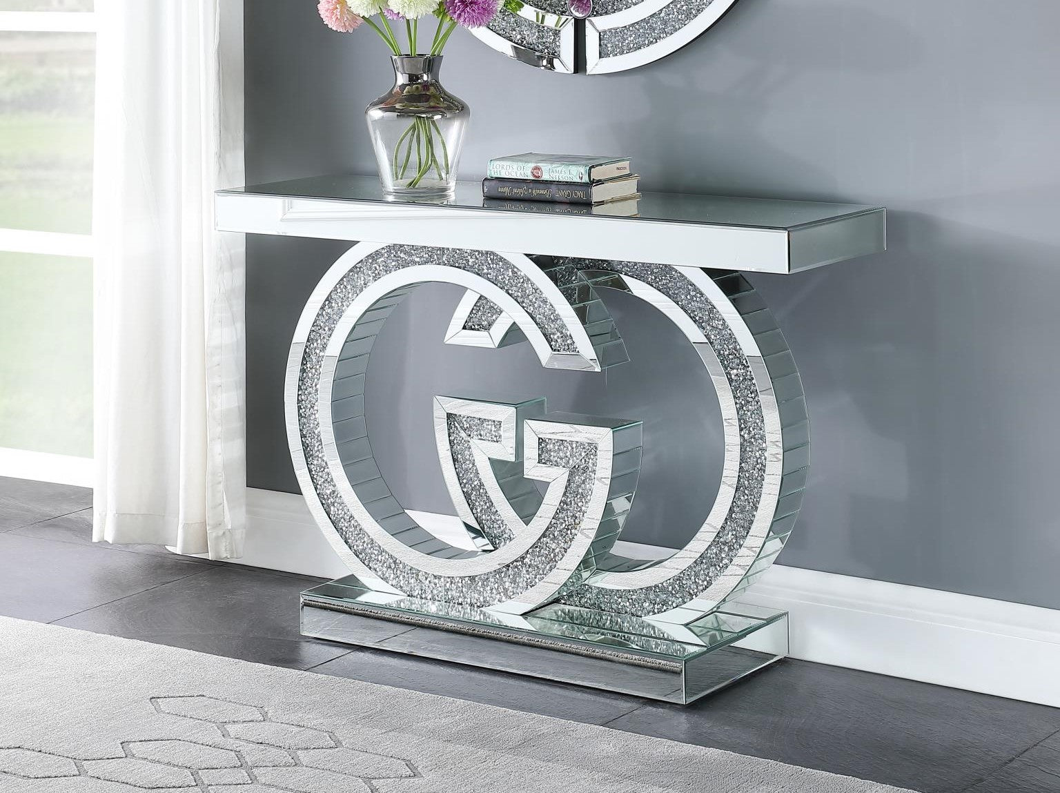 Glam up your living space with this contemporary console table. This silver finish console table has a mirrored effect for a punch of contemporary glam. The geometric design displays a disc body framed by a rectangular base and tabletop for a sculptural aesthetic. Silver accent crystals provide textural dimension to the circular body. This contemporary console table works well in a space with a Hollywood glam theme.