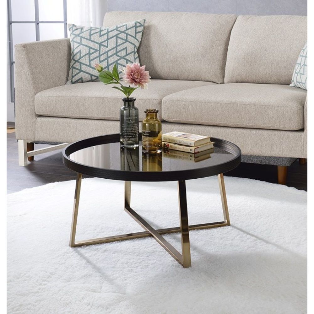 KD, Round Coffee Table • NO Storage (Open Base) • Features: Wooden Top, 5mm Mirror Inlay, Metal "X" Style Base •• CONSTRUCTION •• TOP) Wood Top w/Mirror Inlay: Wood Veneer, Bentwood, MDF, 5mm Mirror; Thickness: 1.5 Inches • BASE) Metal "X" Shape: Champagne Finish, Metal Tube •••