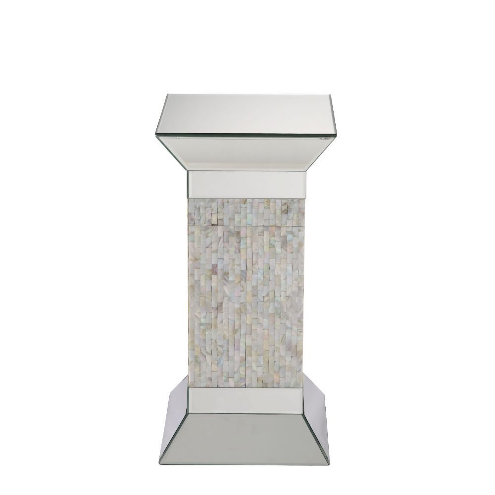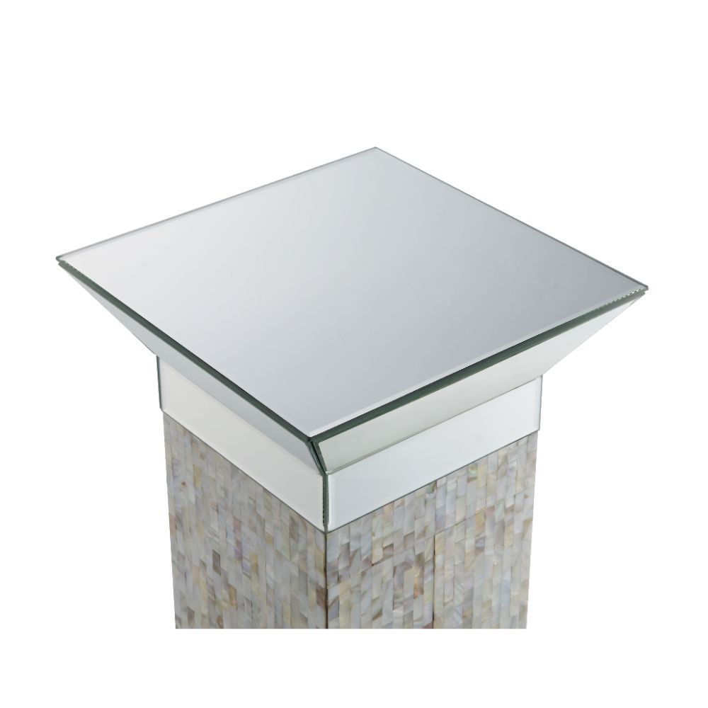 Assambled, Square Pedestal Stand • NO Storage •• CONSTRUCTION •• Beveled Mirrored Top & Apron: Mirror, MDF (Fixed Top) • Mirrored Pedestal