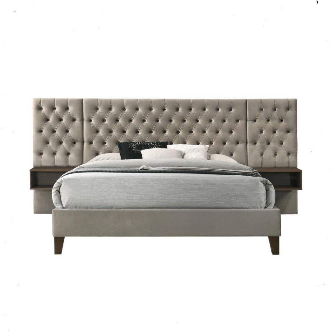 Upgrade to the refined style and inviting sophistication of a modern upholstered bed. Designed to impress while offering a welcoming retreat from the world, the bed features light brown fabric with deep button tufting in a diamond pattern that creates wonderful texture and dimension. The three-panel design includes floating nightstands, ensuring bedside storage while maintaining a light, airy ambiance in your bedroom. The nightstands are open cubes, each in a rich brown finish with a wood look, perfectly complementing the silhouette of the bed. Classic upholstered rails complete the look while tapering legs ensure support and stability.