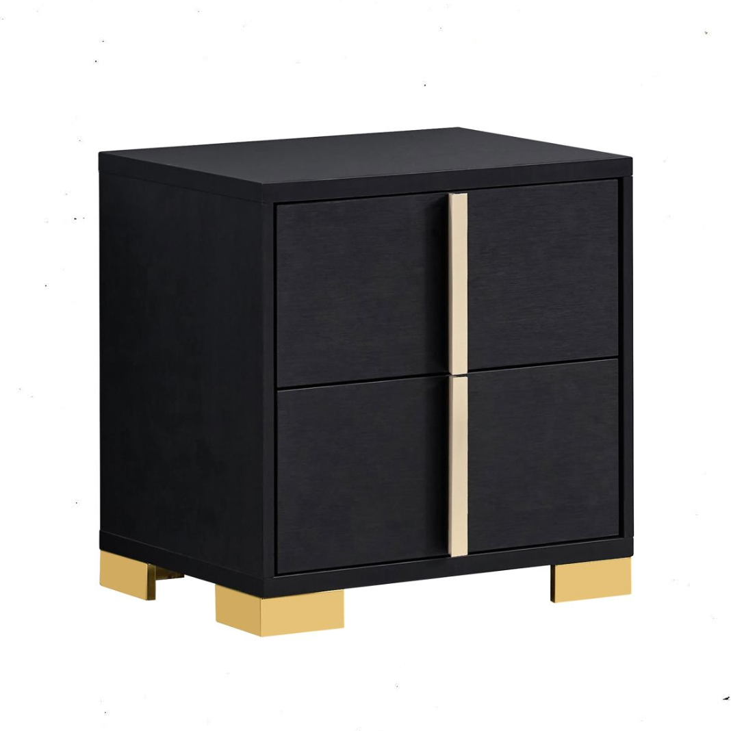 A bold look leans exotic and alluring to transform your master or guest bedroom into an inviting venue. Modern design details produce a chic nightstand with an Art Deco vibe and tons of elegance. Made of wood products, this two-drawer nightstand features a versatile finish with accenting from gold finish metal, placed carefully to emphasize a geometric linear effect. Store incidentals and accessories in two drawers operating smoothly on center metal glides. English dovetail drawer construction embellishes this nightstand’s quality, as vertical gold metal hardware offers a unique impact.