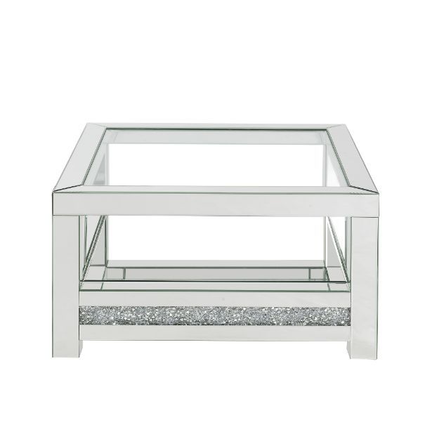 Add sparkle into your life with this striking Noralie mirrored and faux diamonds coffee table. The clear tempered glass top is as beautiful as it is sturdy. The large surface area gives you room for displaying your reading materials or other collectibles. It features a multi-function lower compartment to suit all your storage and display needs. Adds light and shine to your room decor with the Noralie Coffee Table.