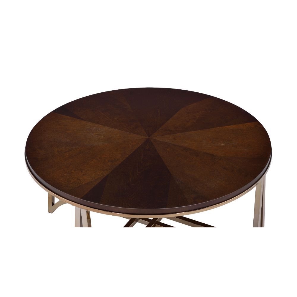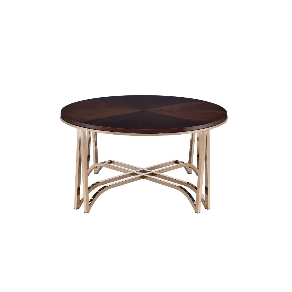 KD, Round Leg Coffee Table • NO Storage (Open Base) • Round Wood Top: Walnut Finish, Birch Parquet Wood Veneer, PB 18mm (Fixed Top/No Apron) • Metal Leg & "X" Crossbar Support Frame: Champagne Finish, Metal Tube (13/26mm, 20/20mm)