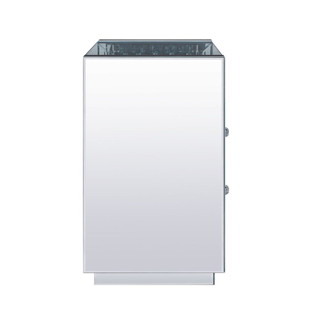 The Nysa End Table will give any room a touch of glamour. This contemporary nightstand is fully mirrored with a beveled edge and stunning glass top with a storage shelf surrounded by faux crystal inlay. Use this unique piece as the perfect accent for any room Decor. Two large drawers provide ample and convenient storage for books, remote controls, jewelry, and more.