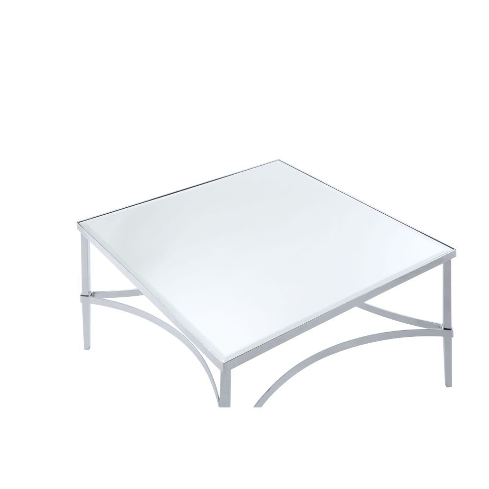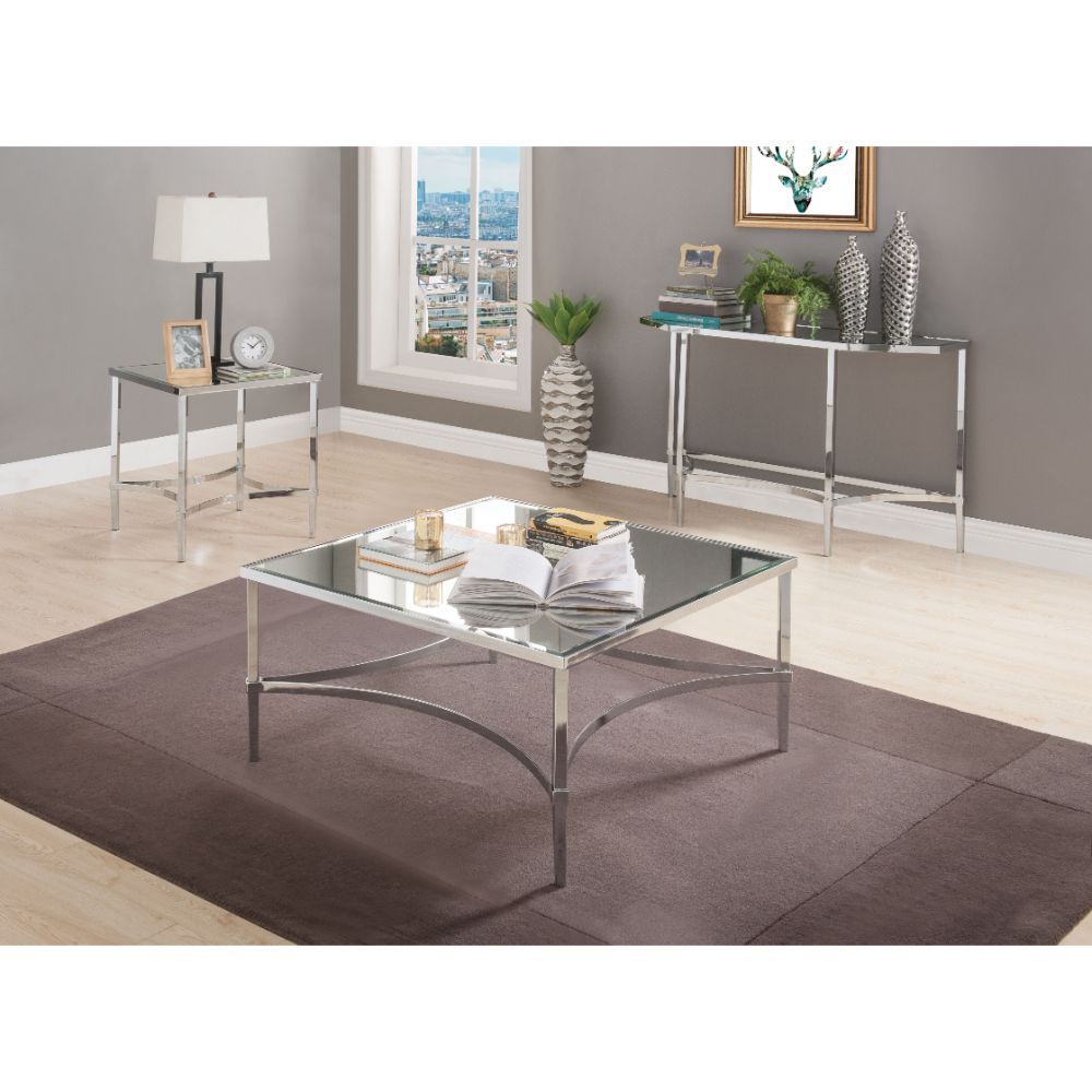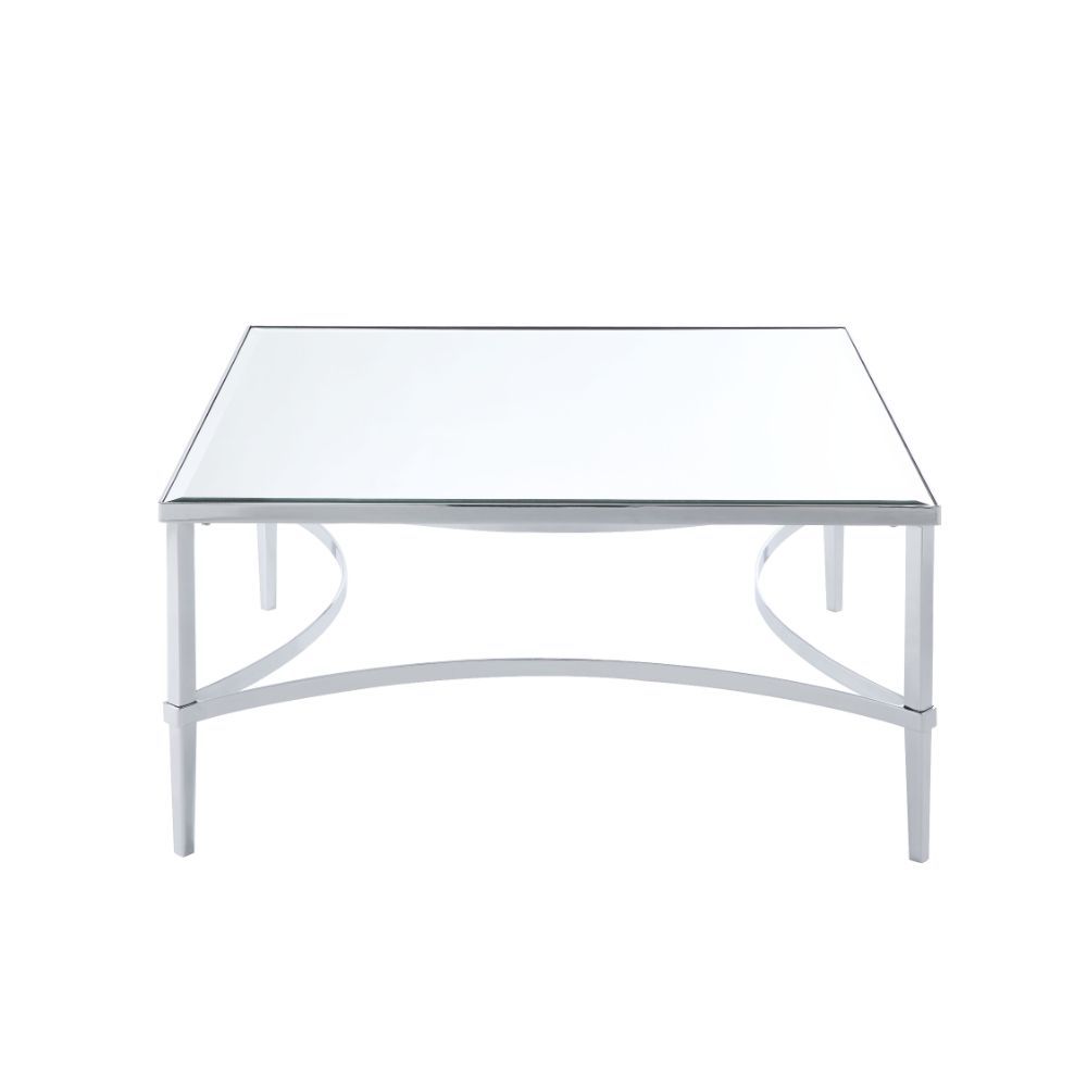 KD, Square Leg Coffee Table • NO Storage (Open Base) • Beveled Mirrored Top & Chrome Finish Legs •• CONSTRUCTION •• Mirror Top: 5mm Mirror with Beveled Edge (No Apron) • Metal Straight Leg, Top Trim & "Diamond" Crossbar Support Frame: Chrome Finish, Metal Tube (13 x 26 x 1.2mm)