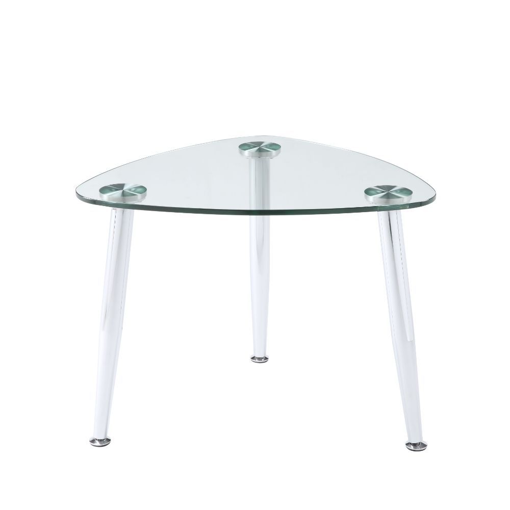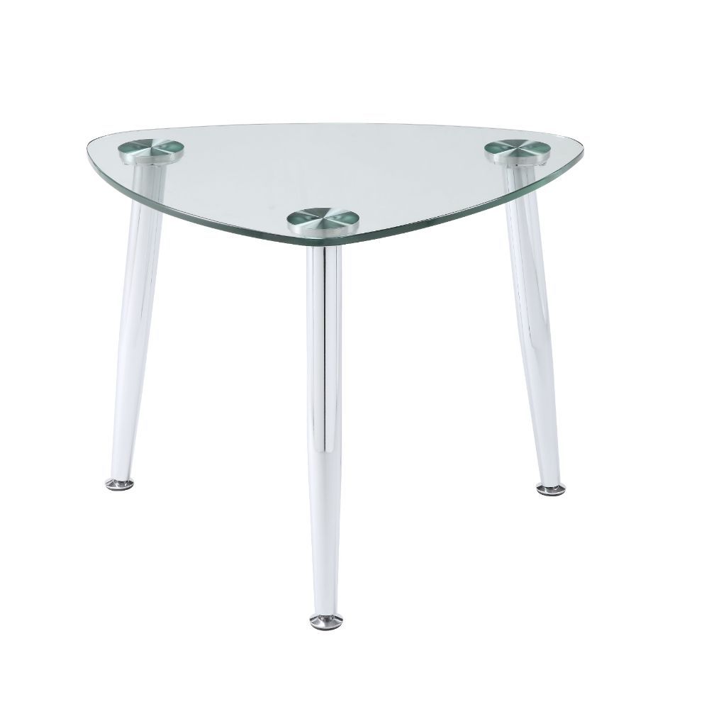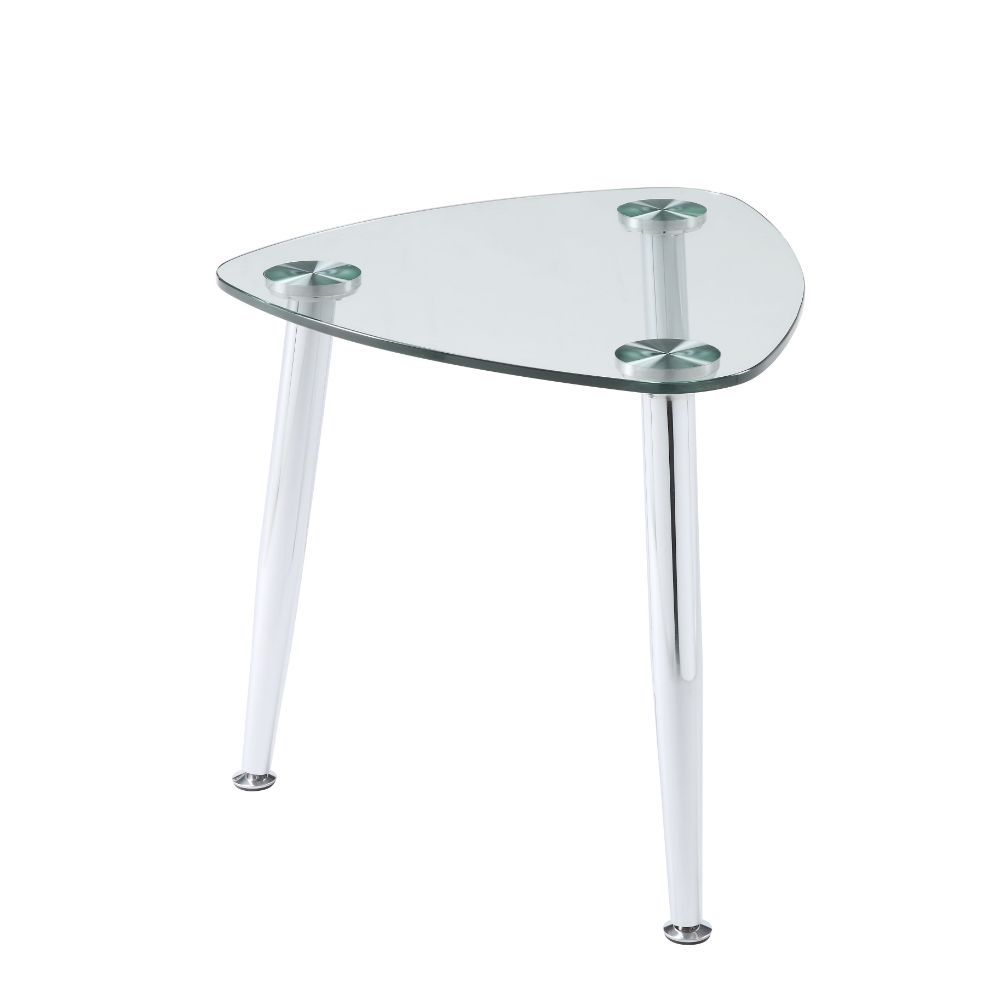 KD, Triangular Leg End Table • NO Storage (without Shelf/Open Base) • Glass Top: 12mm Clear Tempered Glass without Beveled Edge (Fixed Top/No Apron) • Metal Tapered Leg: Chrome Finish, Metal tube (Dia 50 x 1.2mm)