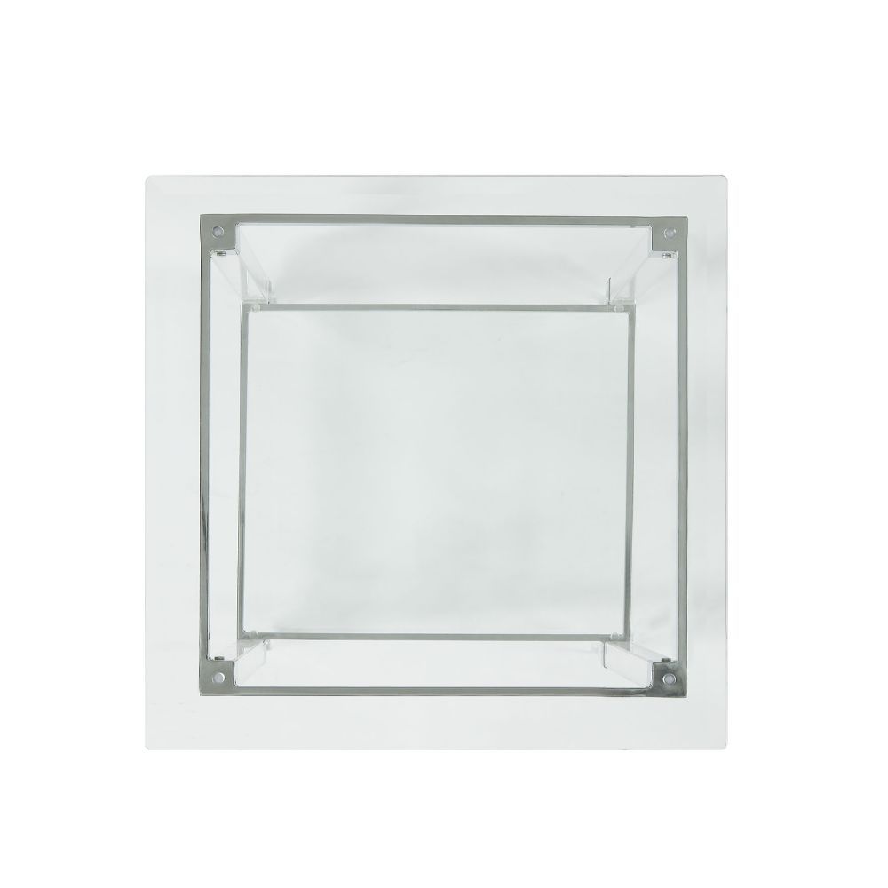 KD, Square Leg End Table • Storage: Open Compartment (Bottom Glass Shelf) •• CONSTRUCTION •• Glass Top & Shelf: Clear Tempered & Beveled (0.75"), 8mm Top, 5mm Shelf (Fixed Top/No Apron) • Acrylic Tapered Leg: Clear Finish, Leg Size: 24 Inches Height • Metal Top Trim & Crossbar Support Frame: Chrome Finish