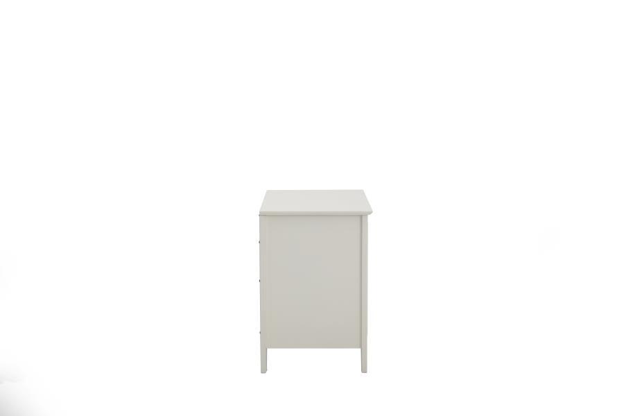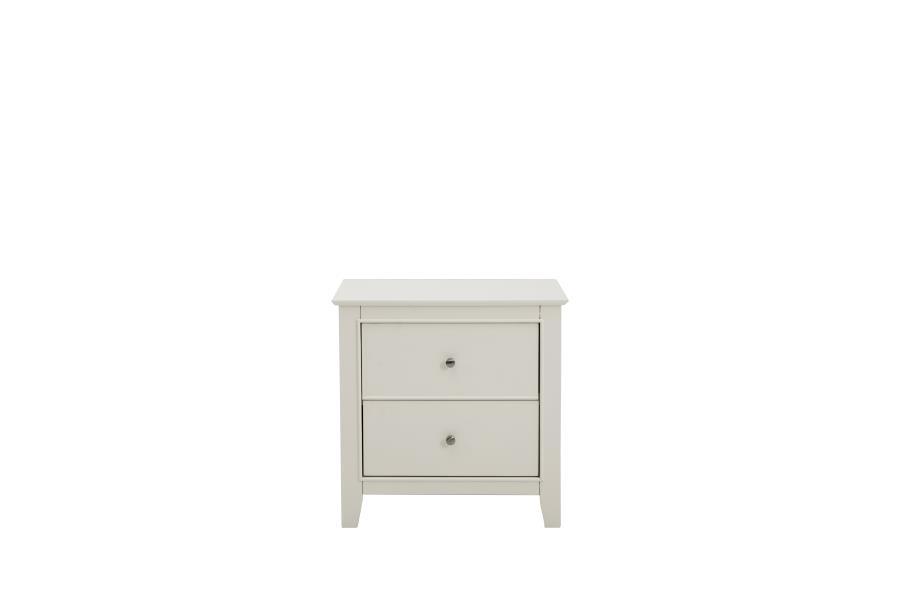 Included in the selena collection is this wood nightstand. it's constructed of tropical hardwoods and veneers that are both gorgeous and practical. stand top is roomy enough for an antique table lamp and a tablet. two spacious drawers perfect for an extra fleece or nighttime reading material feature stylish metal accents to add flair to the versatility. finished in crisp buttermilk that matches bed from the same collection (not included).