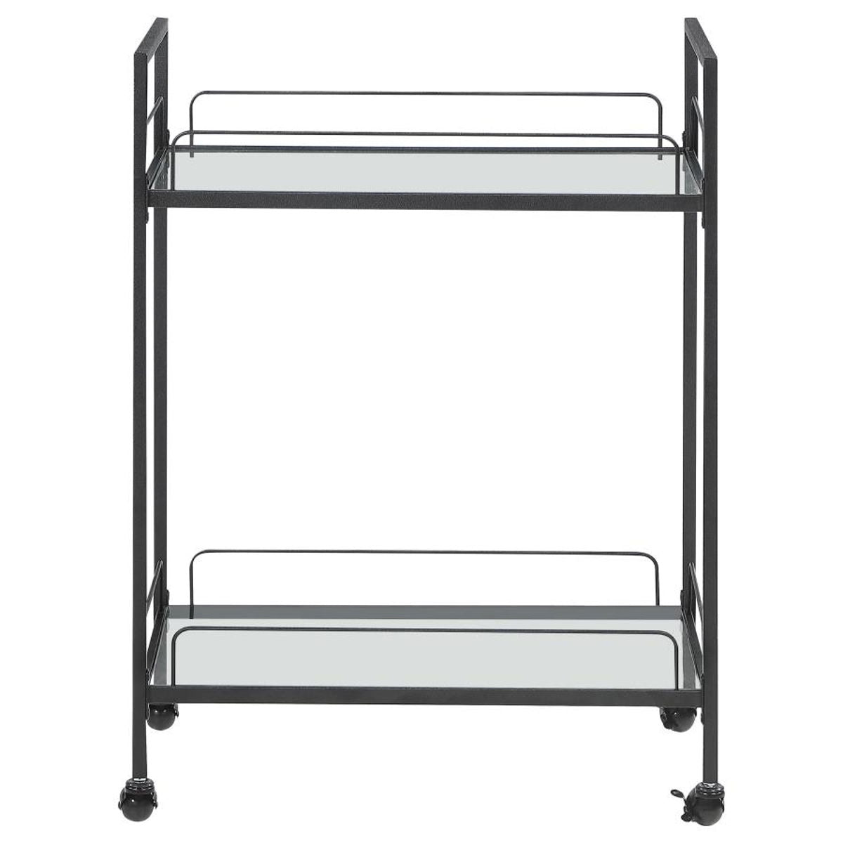 Minimal, clean lines create a versatile and sleek aesthetic to this contemporary serving cart. built with a slim metal frame in a black hammertone powder coated finish with caster wheels, this serving cart welcomes glassware, accessories and snacks to be smoothly transported to an entertaining area for guests and visitors. stacked clear tempered glass shelves showcase stemware and favorite vintages to guests for their personal selection. with raised edges, you can rest easy knowing everything stays in place safely. glide this serving cart into your living room for small get-togethers or keep it in a compact apartment as a multifunctional bar cart.