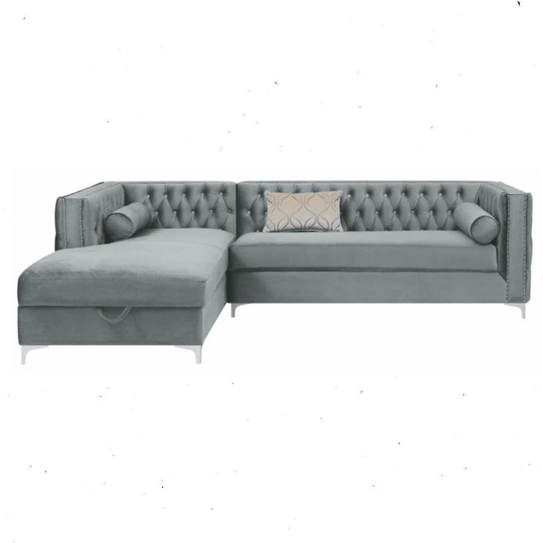 Contemporary style from this chaise sectional dresses up any living room. Glamorous and brilliant, shiny crystal button tufting adorns the back cushion and portion of the frame. Fully upholstered, the bold high back and arms exude chic style. A decorative nail head trim runs along the front and top, creating another layer of glimmering detail.