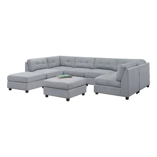This seven-piece modular sectional offers a contemporary feel to a spacious family room or entertaining area. complete with four armless chairs, two corner chairs and one ottoman, this transitional sectional creates the ultimate gathering space for family and guests. designed with tufted cushions and wrapped in a dove gray woven fabric, this plush seating arrangement is the place to go to read, nap, binge a tv series and much more. black feet offer a slight elevation and extra stability, defining the silhouette of this boxy design. lastly, an unattached ottoman doubles as a coffee table, floated in the center of this u-shaped sectional.