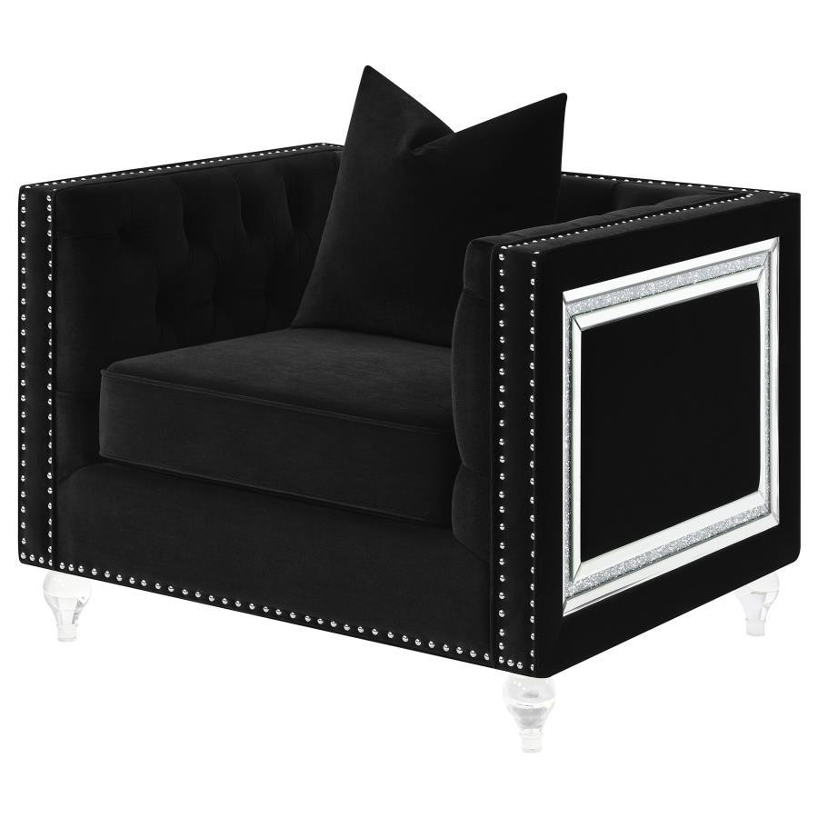 Elevate your living room's style with this tuxedos style club chair. featuring a classic button tufted interior backrest and squared, straight arms, this chair offers a refine, timeless look that blends into a modern decor. accented with sparkling individually hammered nailhead trim and turned acrylic legs, this chair lends an elegance like no other. each arm also features window shape accent with lustrous mitered mirror and acrylic crystal frame inset, adding a hollywood regency flair. perfectly suited for contemporary living rooms and seating areas, this glamorous club chair is also wrapped in a deep black velvet upholstery, allowing it to complement color palettes and match existing decor tastes.