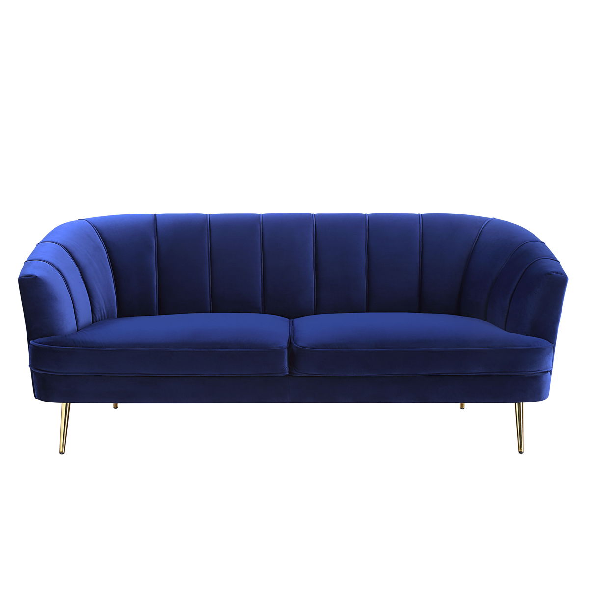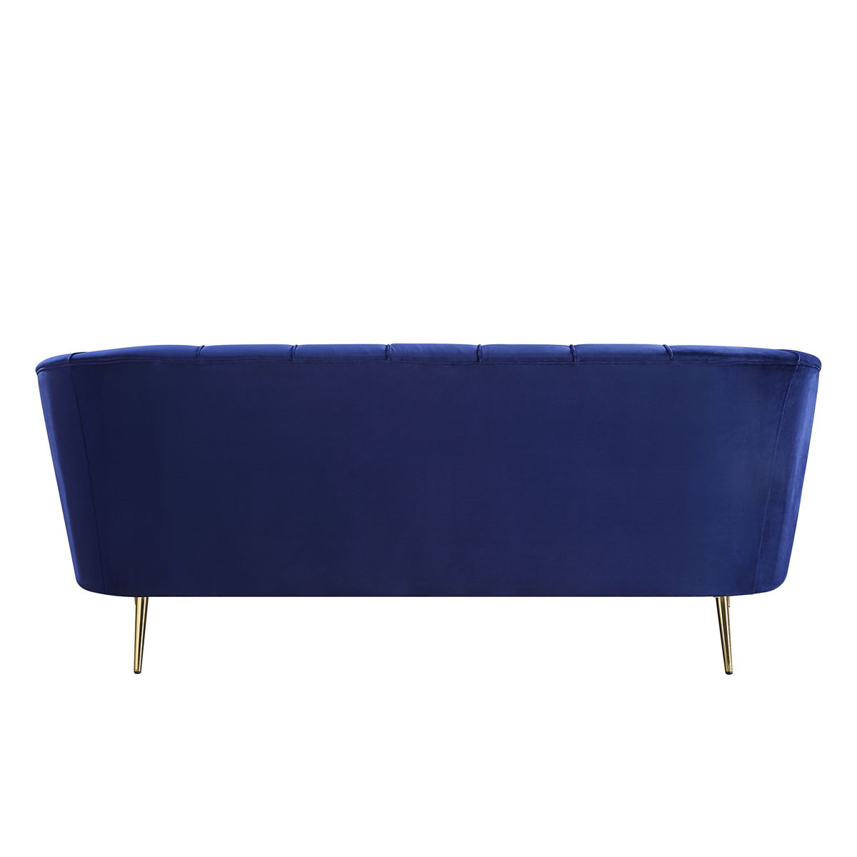 This Eivor trendsetting collection will add style and color to any room. The collection features soft feminine curves and channel tufting to create a modern home. Upholstered in a sumptuous blue velvet that is classy and bold. The metal legs and wooden inner frame make for a sturdy piece that will last for years to come. The sofa is ideal for leaning back and relaxing in style. Expand your seating area with the matching chairs.