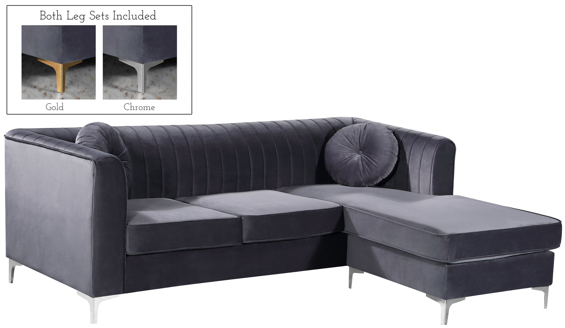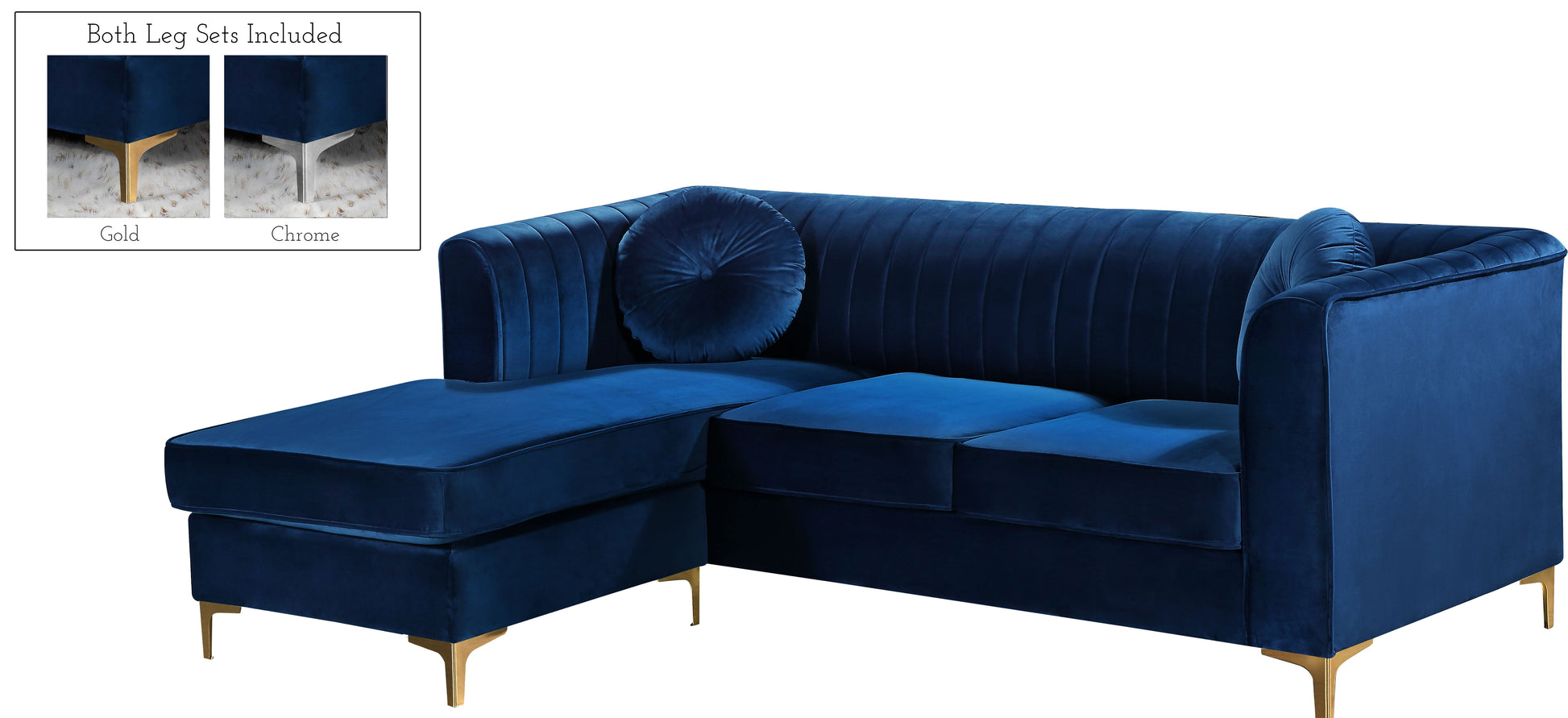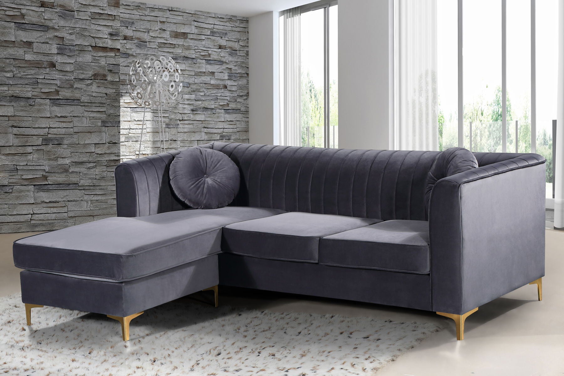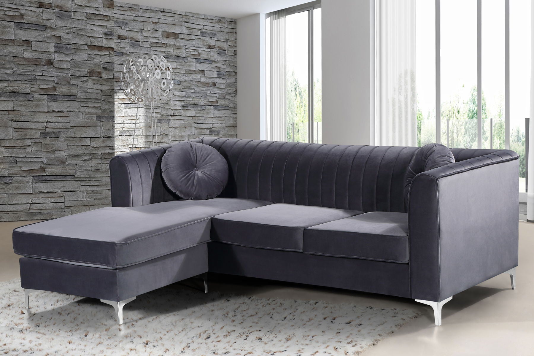 Spend your evenings lounging on this Eliana Reversible Sectional. This sectional has a chaise end to give you lots of legroom during your nap, and its elegantly plush velvet upholstery ensures it feels luxurious to the touch. The velvet color is exciting and fun and lends a touch of boldness to otherwise neutral decor or other furnishings in your space. A channel-tufted back adds to its durability and prevents cushion shifting. Both legs are included so use it with the legs or legs, it's your choice!
