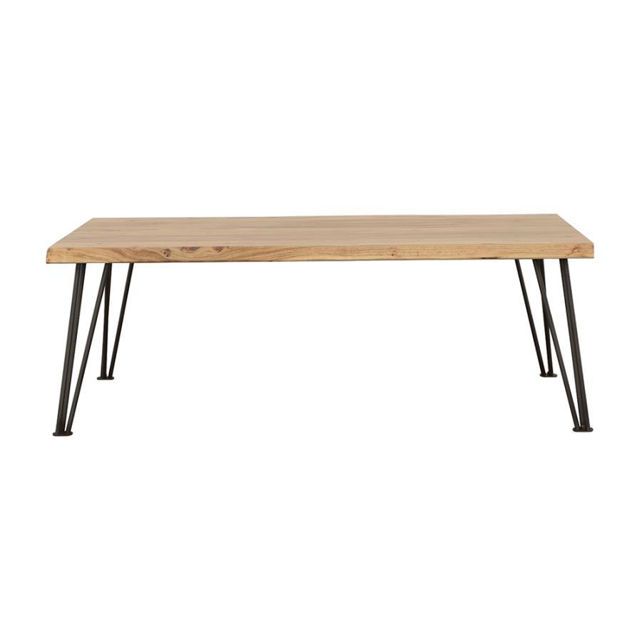 The acacia wood tabletop of this coffee table makes a striking statement piece. and as the perfect addition to a seating arrangement in front of a sofa, this coffee table offers a live edge detail that further accentuates the natural elements. plus, the acacia wood offers a sustainable material for green-friendly homes and lifestyles. as a whole, this coffee table lends itself to several home styles and adds a natural element to any space. supported by iron hairpin legs in a matte black powder coated finish, this coffee table is perfect for supporting a tray of refreshments and snacks to serve to family and guests.