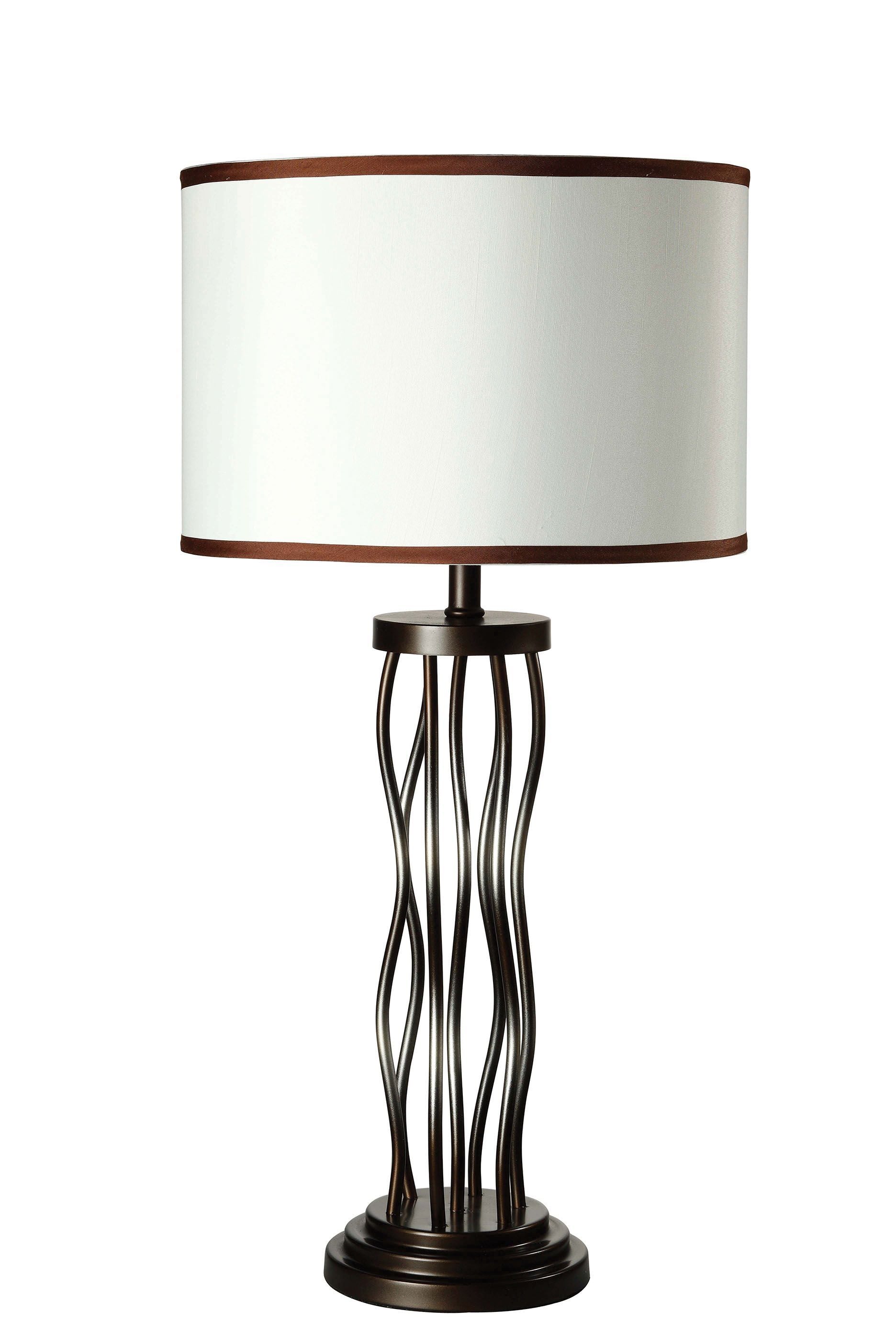 Add abstract design with this contemporary inspired Jared table lamp to your nightstand. This lamp features a metal curved base with an antique bronze finish, topped with a drum shaped shade creating a work of art as well as a functioning light source.
