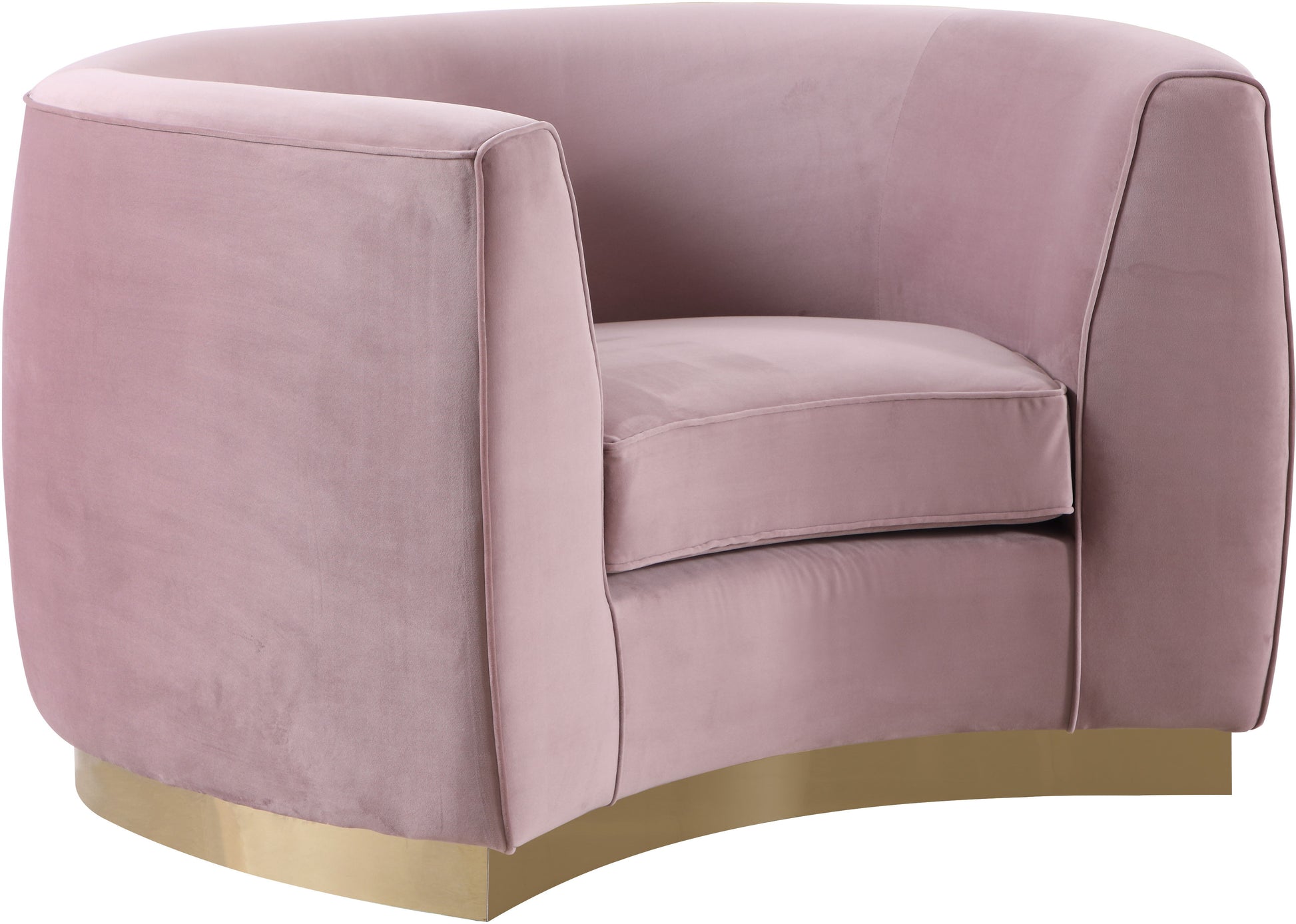The perfect mix of velvet and stainless steel comes to life in your space with this Julian Chair. This bold velvet chair comes upholstered in rich, sumptuous-to-the-touch velvet to make a fashionable statement in your space. The curved back design lends it a modish touch, and the stainless steel trim around its base adds to its glitzy appeal. Stage this chair alone or with other pieces in the Julian collection.