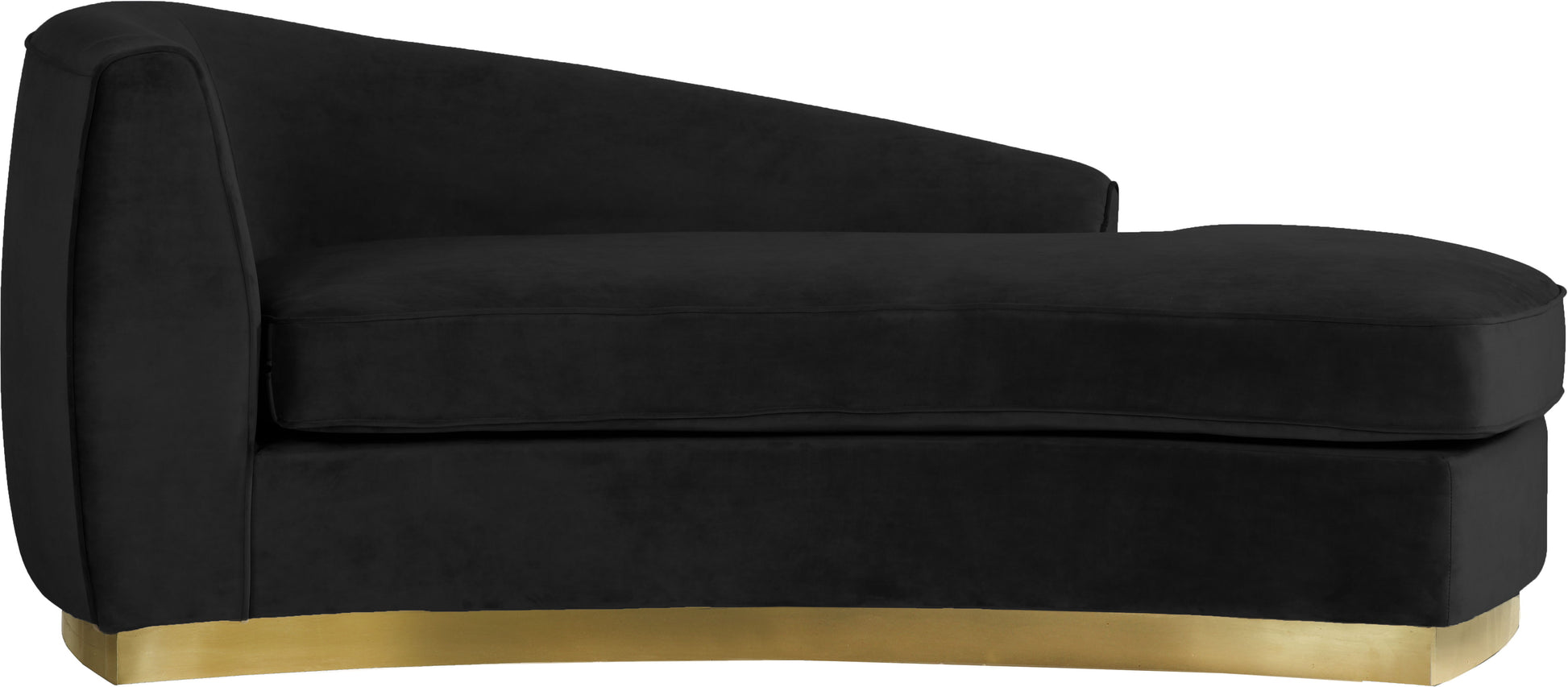 The perfect mix of velvet and stainless steel comes to life in your space with this Julian Chaise. This bold velvet chaise comes upholstered in rich, sumptuous-to-the-touch velvet to make a fashionable statement in your space. The curved back design lends it a modish touch, and the stainless steel trim around its base adds to its glitzy appeal. Stage this chaise alone or with other pieces in the Julian collection.