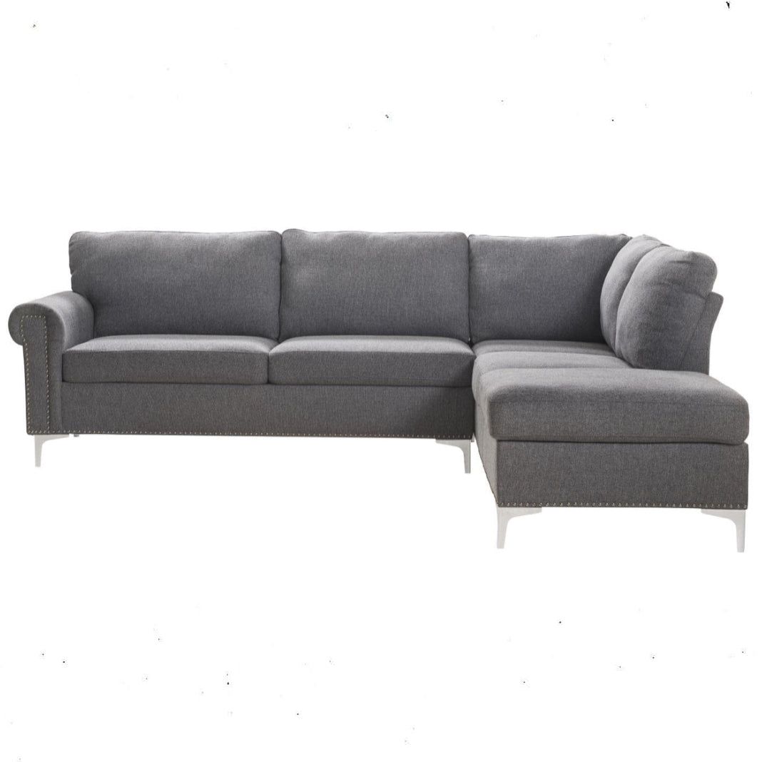 The striking Melvyn sectional sofa is sure to imbue your entertainment space with a touch of updated, contemporary style. A fusion of style and comfort, the sofa features a clean-lined silhouette with a durable wood frame and chrome-finished legs. This modern L shaped sectional features a left facing loveseat and right facing chaise. Wrapped in a rich chocolate fabric upholstery with a rolled arm with nailhead trim, ideal for any living room Decor. This sleek design sofa truly is the picture of modern aesthetics.