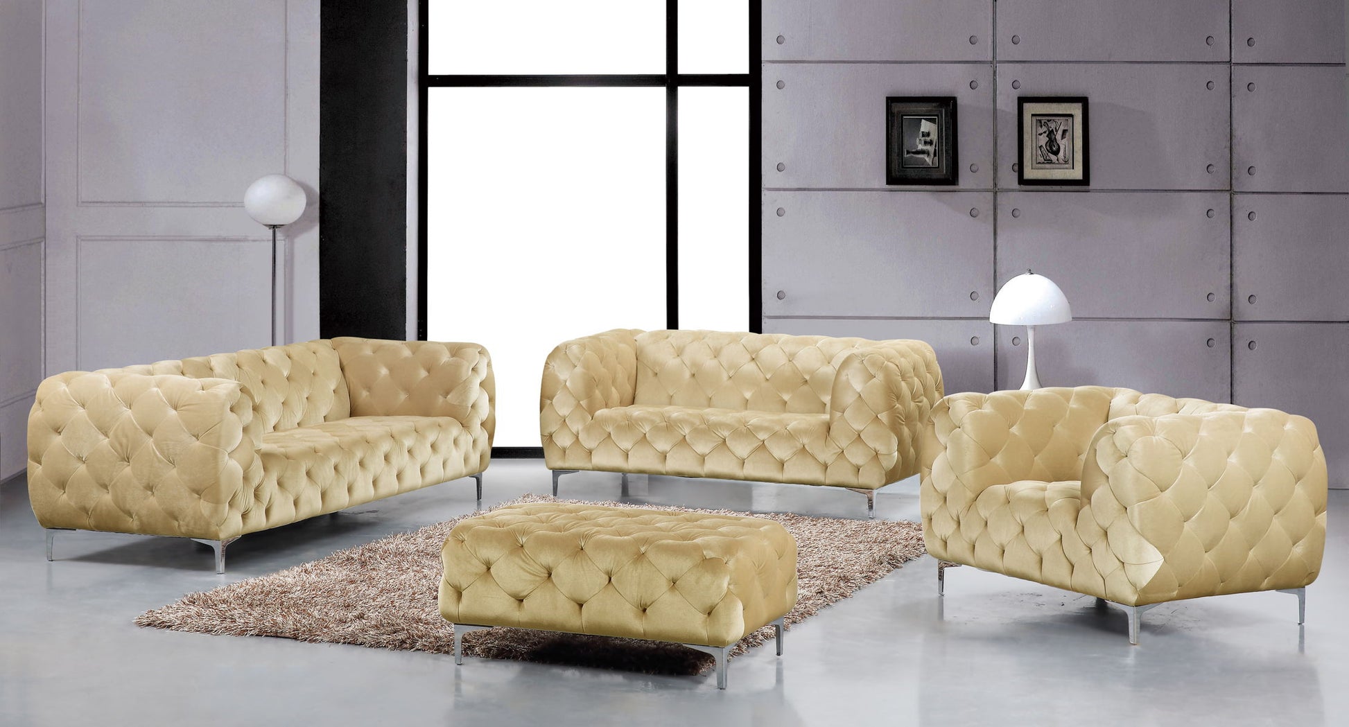 Elegant and eye-catching, the stunning Mercer Living Room from Meridian Furniture is the perfect addition to any space. covers the plush, comfortable seat, padded with high-density foam and modern tufted design. Strength and beauty is guaranteed with a solid wood frame and legs.