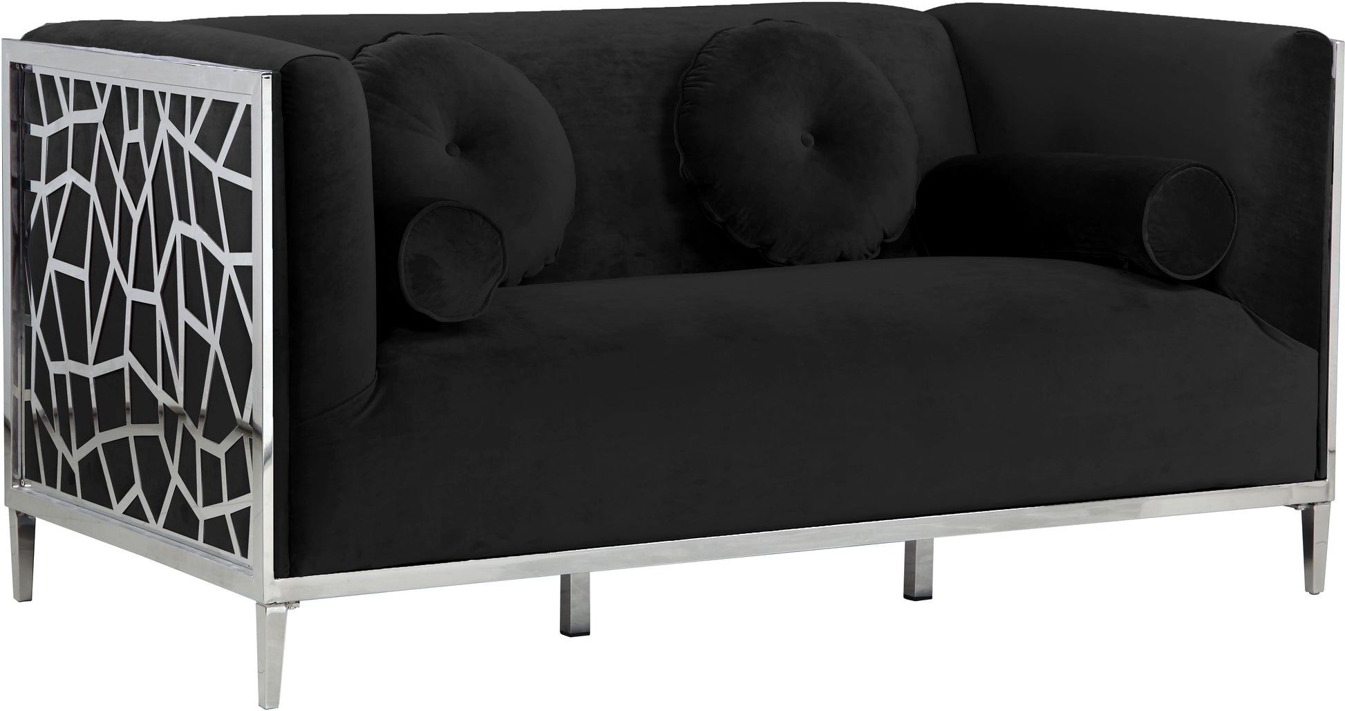 Catch the eyes of all who step foot in your home with this bold Opal velvet loveseat. Its stainless steel patterned design creates a contemporary flair against its plush, velvet upholstery, creating a home accent piece that is both comfy and stylish. Its roomy design offers ample room to kick back and relax after a long day, while its stocky shape adds a daring touch to your decor.