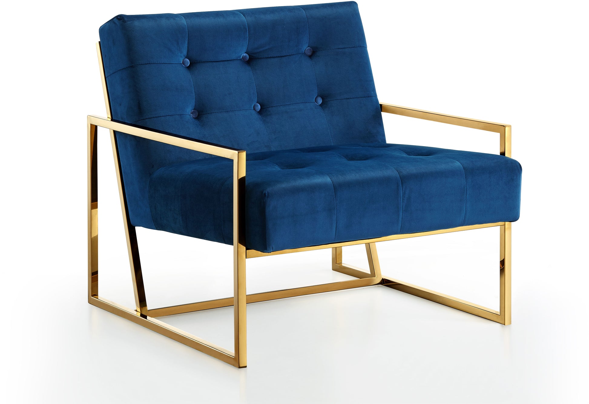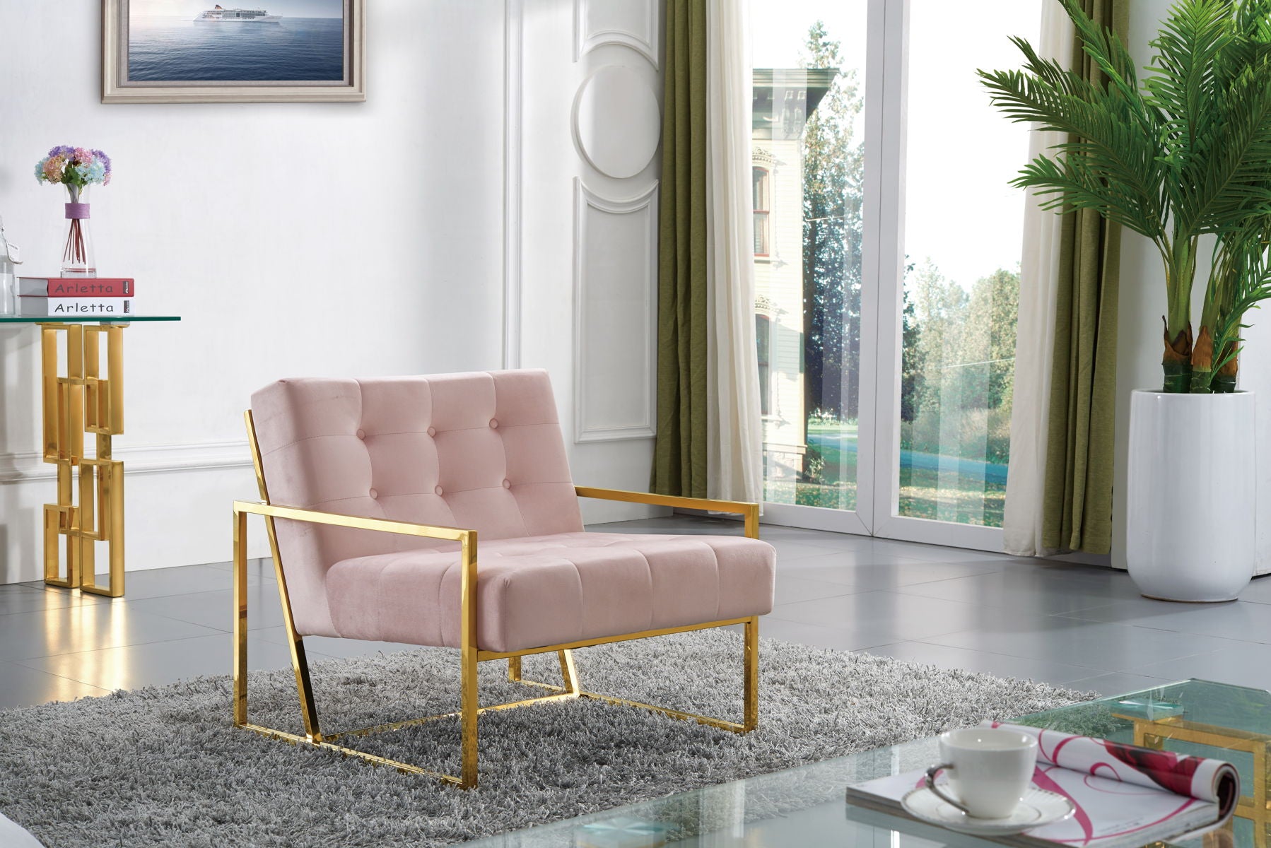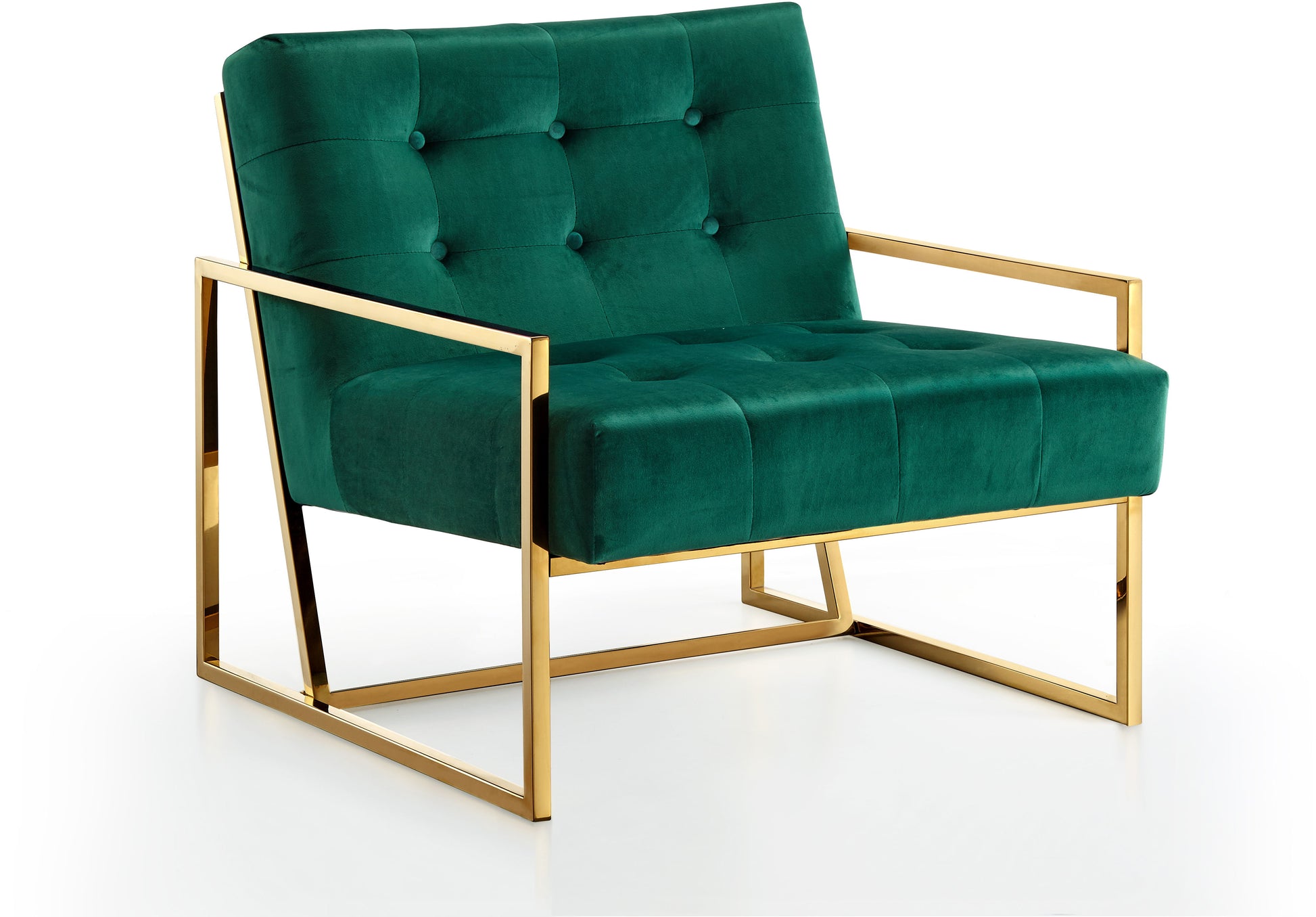 Give your room a touch of elegance and refinement with this ultra modern Pierre velvet accent chair. The base is made from stainless steel, so it's durably tough and strong enough to withstand heavy daily use. The base is finished in a tone hue, adding to its luxurious feel. Tufting on the thick back and seat cushions add to their durability and give it a welcoming look. The color makes the chair an easy fit with existing furnishings.