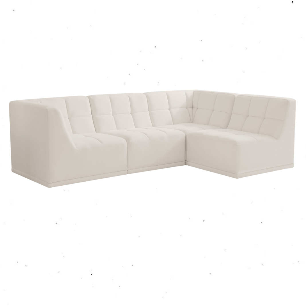 Bolster a contemporary vibe in your living room with this Relax cream modular sectional. Soft cream velvet upholstery offers delicate comfort, making this sectional cozy for anyone who sits in it. Biscuit tufting gives this sectional texture and a modern style, adding extra comfort and elegance to your living space. It s modular design allows you to create infinite configurations, making it a versatile piece to add to your home. A latch underneath the sectional makes it easy to attach to other pieces.