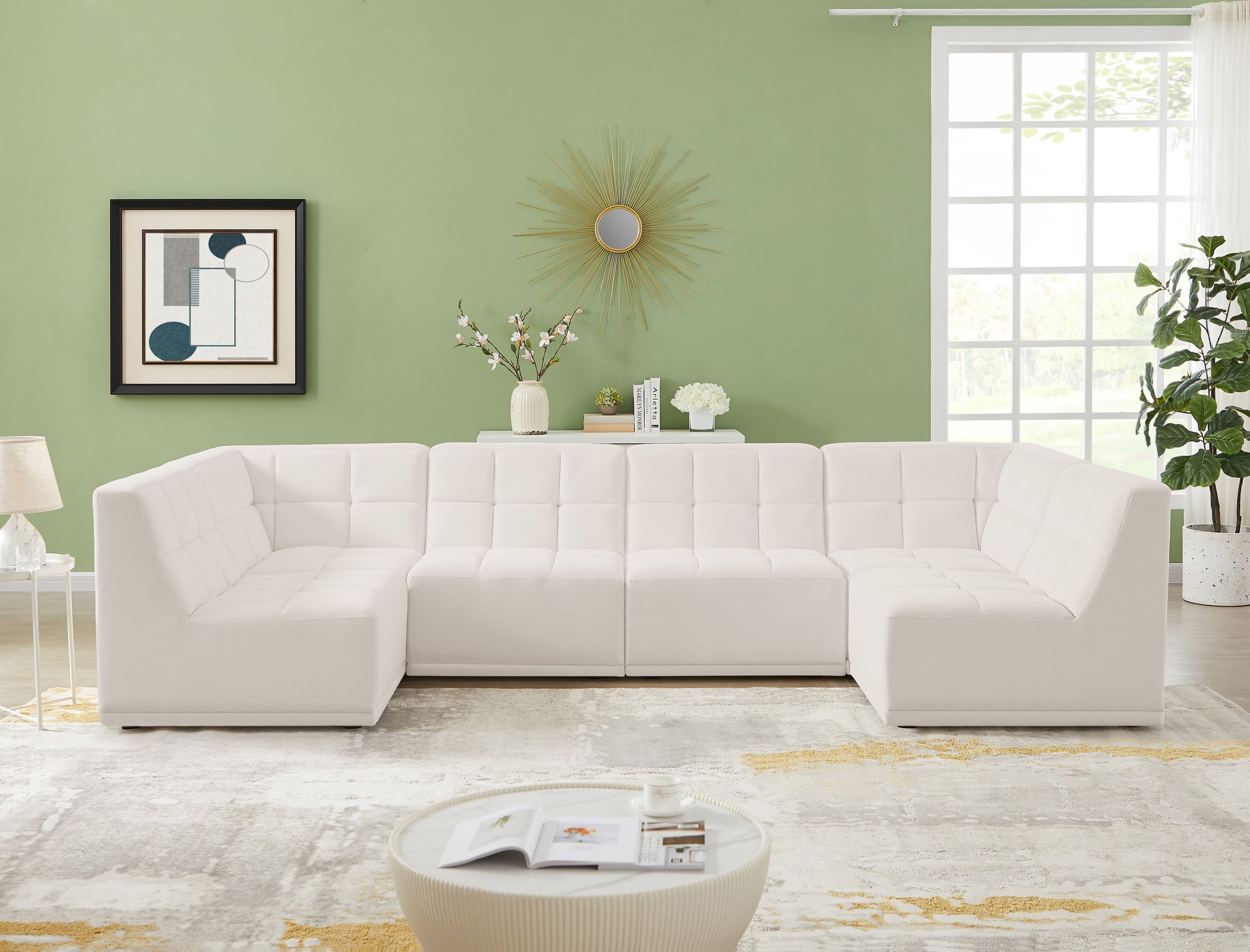 Bolster a contemporary vibe in your living room with this Relax cream modular sectional. Soft cream velvet upholstery offers delicate comfort, making this sectional cozy for anyone who sits in it. Biscuit tufting gives this sectional texture and a modern style, adding extra comfort and elegance to your living space. It s modular design allows you to create infinite configurations, making it a versatile piece to add to your home. A latch underneath the sectional makes it easy to attach to other pieces.