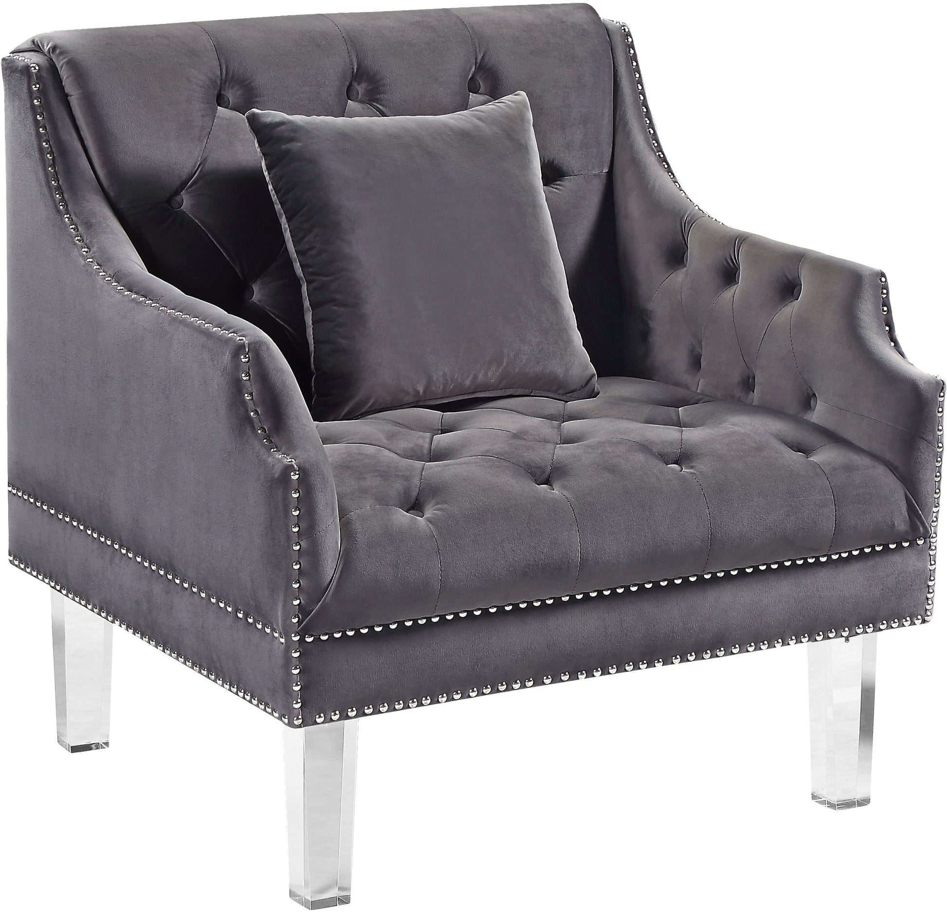Bring a posh look home with this Roxy Chair. The velvet is both striking yet unobtrusive, giving your room an elegant style boost while providing you with a comfortable spot to sit and relax while reading or watching TV. Deep button tufting gives the chair a touch of texture while ensuring its sophistication is lost on no one. Add this contemporary chair on its own to your living room or den, or buy it alongside the coordinating sofa and loveseat for a complete and total makeover.