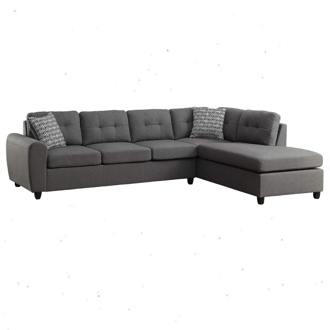 Create a stylish focal point in a den or living room with this gorgeous, grey sectional. its linen-like upholstery is enhanced by subtle tufting, giving it a cool, casual look. it comes complete with accent pillows for extra comfort and style. its reversible construction offers convenient versatility. with its large size and built-in chaise, it's perfect for stretching out solo or seating multiple guests comfortably.