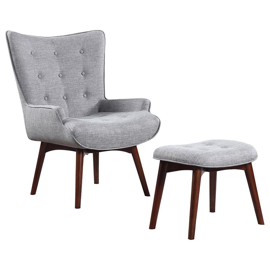 This accent chair with ottoman adds convenience and style to a home study or tv room. they both are gorgeously appointed in grey fabric with button tufting. the chair features a slightly flared, slightly curved back and low armrests for easy relaxing. both offer plush cushioning for ultimate comfort. legs are finished in warm brown and slightly angled for a distinctive piece that's durable and reliable.